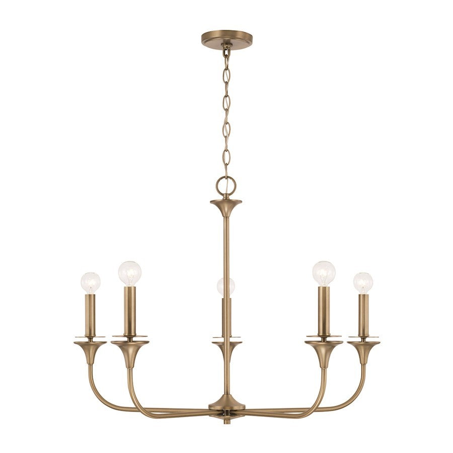 This item is an open box item that are like new at extremely discounted prices. Each item has been carefully inspected and repackaged. These units have not been previously used or installed. Featuring sleek contours and flared accents, the Presley 5-Light Chandelier for HomePlace brings high design to every home. The Aged Brass finish invites a classic aesthetic that mixes with any style.