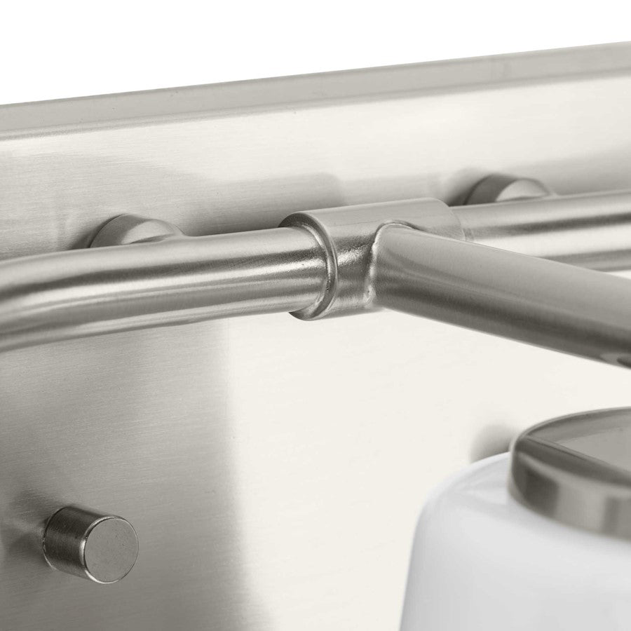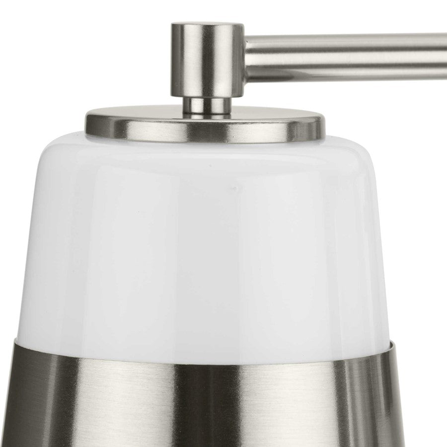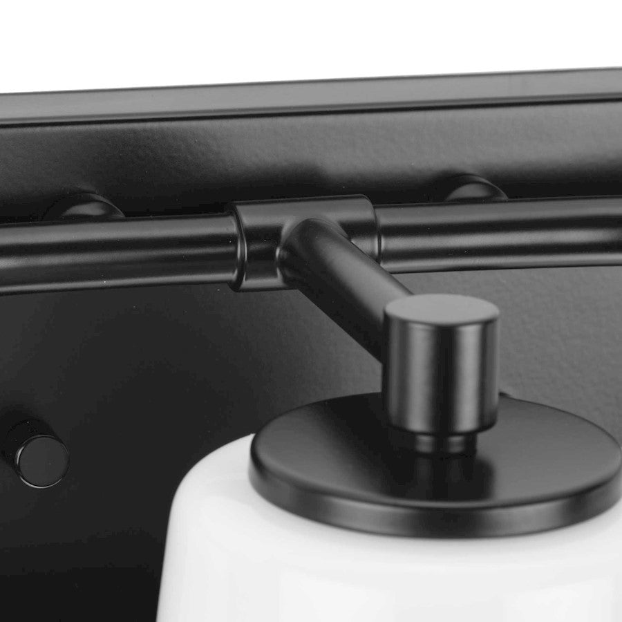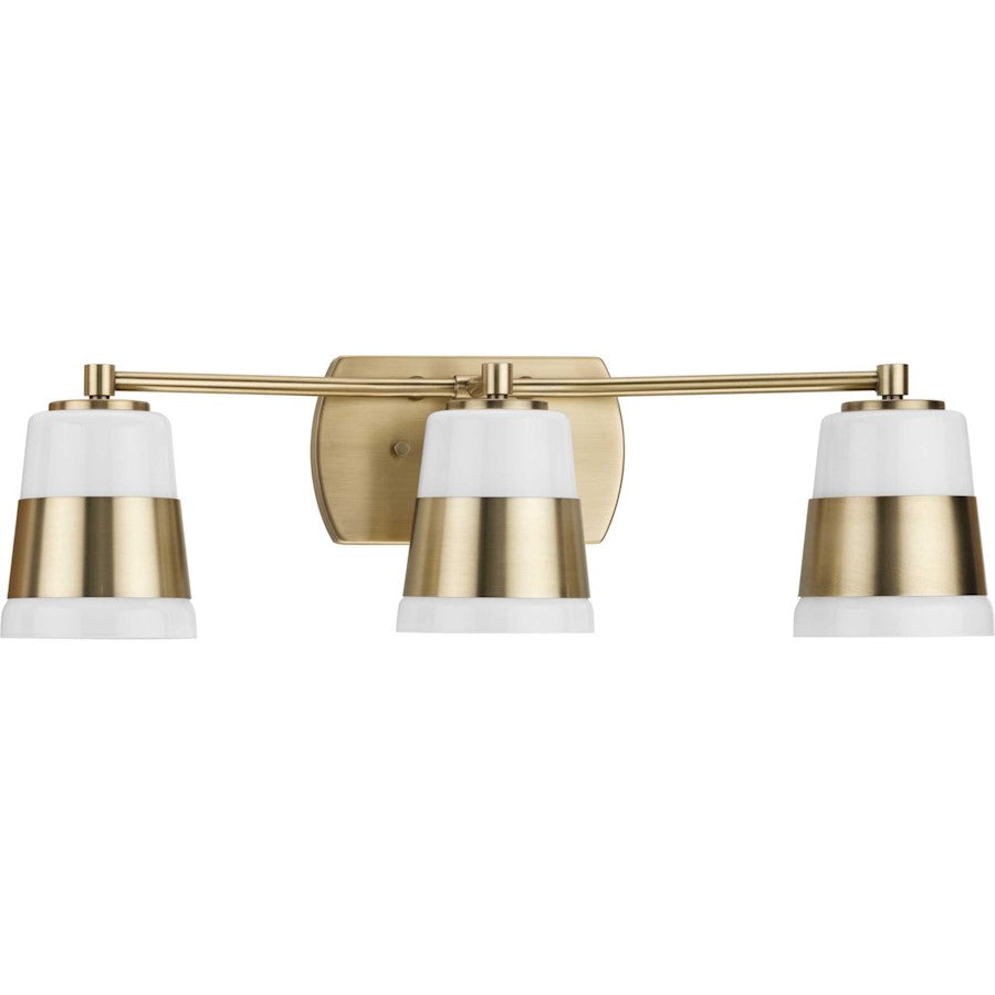 The Haven Vanity Light casts a pleasing, softened glow in bathrooms and powder rooms; The light is practical and stylish with a modern color blocking silhouette that fits perfectly in luxe industrial and contemporary settings; The elegant, contemporary metal frame is finished in soft brushed nickel or crisp matte black or vintage brass; Etched opal Glass shades casts a pleasing, softened glow; Mount the light fixture with the Glass facing up or down for more design flexibility; Uses (3) 100-Watt maximum, medium base bulbs or LED equivalent, that is sold separately, and dimmable when used in conjunction with a dimmable bulb; Measures 24-in. width by 7-in. height, extends from wall 6.75-in.; Certifications: CULus Damp Location listed, fixture can be used in rooms where moisture may be present; Warranty: Our 1-Year Limited Warranty guarantees your complete satisfaction with your purchase and includes professional after-sales customer service support; Includes installation instructions and mounting hardware for a quick, easy installation; Progress Lighting products are designed for exceptional quality, reliability, and functionalityHeight to Center: 4.62
