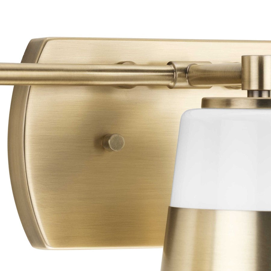 - The Haven Collection is practical and stylish with a modern color blocking silhouette that fits perfectly in luxe industrial and contemporary rooms. The metal frame is finished in soft brushed nickel or crisp matte black or elegant vintage brass and features shades suspended from an oblong backplate. Etched opal Glass casts a pleasing, softened glow in bathrooms and powder rooms. This versatile fixture can be mounted up or down, increasing its design flexibility. It is cULus damp location listed, with a one-year warranty to guarantee your complete satisfaction. Progress Lighting products offer exceptional quality, reliability, and functionality.