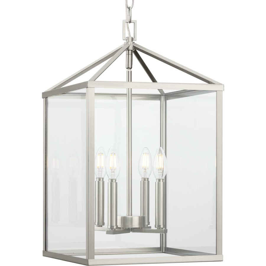 The light's updated classic silhouette is ideal for Transitional and Modern Farmhouse settings.; Brings a distinct look to ceilings in halls, foyers, and kitchens; Its angular frame is finished in subtle brushed nickel; Clear beveled glass panels surround a classic candelabra base; Foyer light is ideal for welcoming guests and visitors in an entryway; Measures 13-in. sq. by 22-in. height; Uses (4) 60-watt candelabra base bulbs or LED equivalent, that is sold separately, and dimmable when used in conjunction with a dimmable bulb; Includes 48 in. of chain for a variety of ceiling heights and can be used on a sloped ceiling; Warranty: Our 1-Year Limited Warranty guarantees your complete satisfaction with your purchase and includes professional after-sales customer service support; Includes installation instructions and mounting hardware for a quick, easy installation