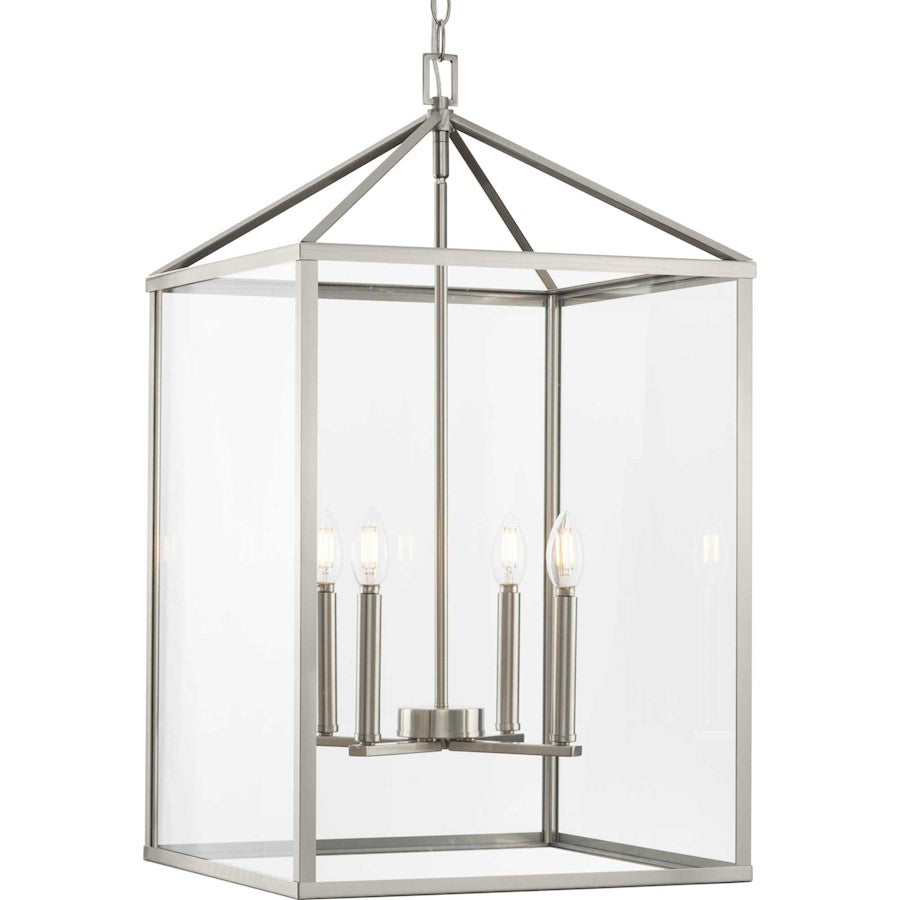 The light's updated classic silhouette is ideal for Transitional and Modern Farmhouse settings.; Brings a distinct look to ceilings in halls, foyers, and kitchens; Its angular frame is finished in subtle brushed nickel; Clear beveled glass panels surround a classic candelabra base; Foyer light is ideal for welcoming guests and visitors in an entryway; Measures 17-in. sq. by 29.75-in. height; Uses (4) 60-watt candelabra base bulbs or LED equivalent, that is sold separately, and dimmable when used in conjunction with a dimmable bulb; Includes 48 in. of chain for a variety of ceiling heights and can be used on a sloped ceiling; Warranty: Our 1-Year Limited Warranty guarantees your complete satisfaction with your purchase and includes professional after-sales customer service support; Includes installation instructions and mounting hardware for a quick, easy installation
