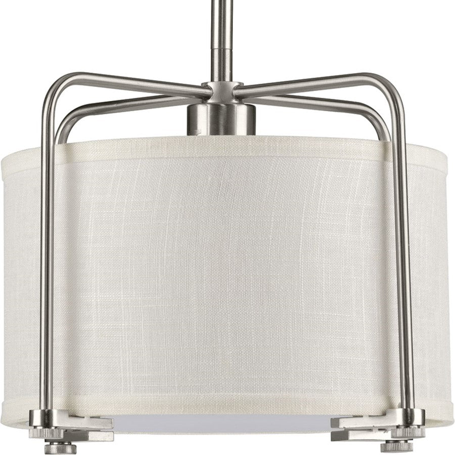 - Perfect for hanging in multiples of two or more over a dining table or kitchen island;A one-light pendant with a metal, curved-corner frame extends to capture the linen shade within its arms;The diffuser elegantly hides the lightbulb while providing soft, comfortable light;Texted linen shade glows from the inside out;Finished in Brushed Nickel with a Summer Linen shade or Antique Bronze with Autumn Linen Shade;The updated classic styling is ideal for transitional and farmhouse interiors;Uses one 75-watt max medium base bulb, or the LED equivalent, that is sold separately;Measures 11-3/4 in diameter X 9 in height, Overall height with stem is 76 in, wire 120 in;Progress Lighting products are designed for exceptional quality, reliability, and functionality