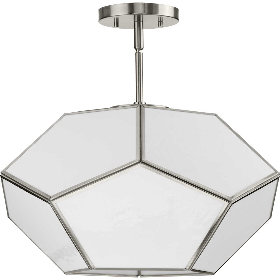 The light's unique framework is ideal for Timeless Modern and Contemporary settings.; Creates a distinct, artful look in halls, foyers, bedrooms, and living rooms; Its geometrical frame is finished in subtle brushed nickel; Banded panels surround white art glass for focused illumination; Alluring lines provide a modern organic statement in contemporary rooms; Measures 18-in. diameter by 11-in. height, if using stem as a close-to-ceiling height is 17.87-in.; Uses (3) 60-watt candelabra base bulbs or LED equivalent, that is sold separately, and dimmable when used in conjunction with a dimmable bulb; Includes four 12" stems and a 90-degree swivel for a variety of mounting types and sloped ceiling; Certifications: CULus Damp location listed, fixture can be used in rooms where moisture may be present; Warranty: Our 1-Year Limited Warranty guarantees your complete satisfaction with your purchase and includes professional after-sales customer service support; Includes installation instructions and mounting hardware for a quick, easy installation