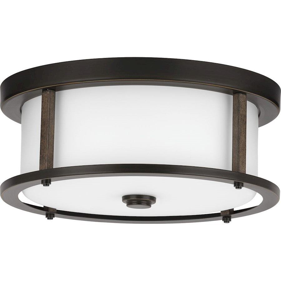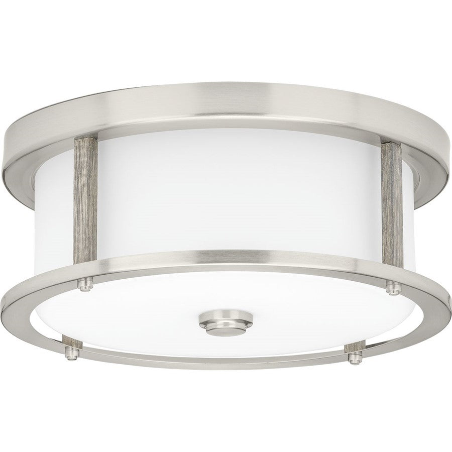 - Optimal for bathrooms, living rooms, hallways, bedrooms, or wherever soothing overhead lighting is desired;The incorporation of faux wood accents offers a natural and organic feel for coastal and modern farmhouse interiors;Two-light flush mount with a simple, clean design;Features a signature, oversized frame banded on its top and bottom;Trimmed in metal with faux wood accents;An etched glass shade fully encloses the bulb;Finished in subtly reflective Brushed Nickel or Bronze;Measures 13 in diameter X 5-1/4 in height;Uses two 60-watt max medium base bulbs, or the LED equivalents, that are sold separately;Progress Lighting products are designed for exceptional quality, reliability, and functionality