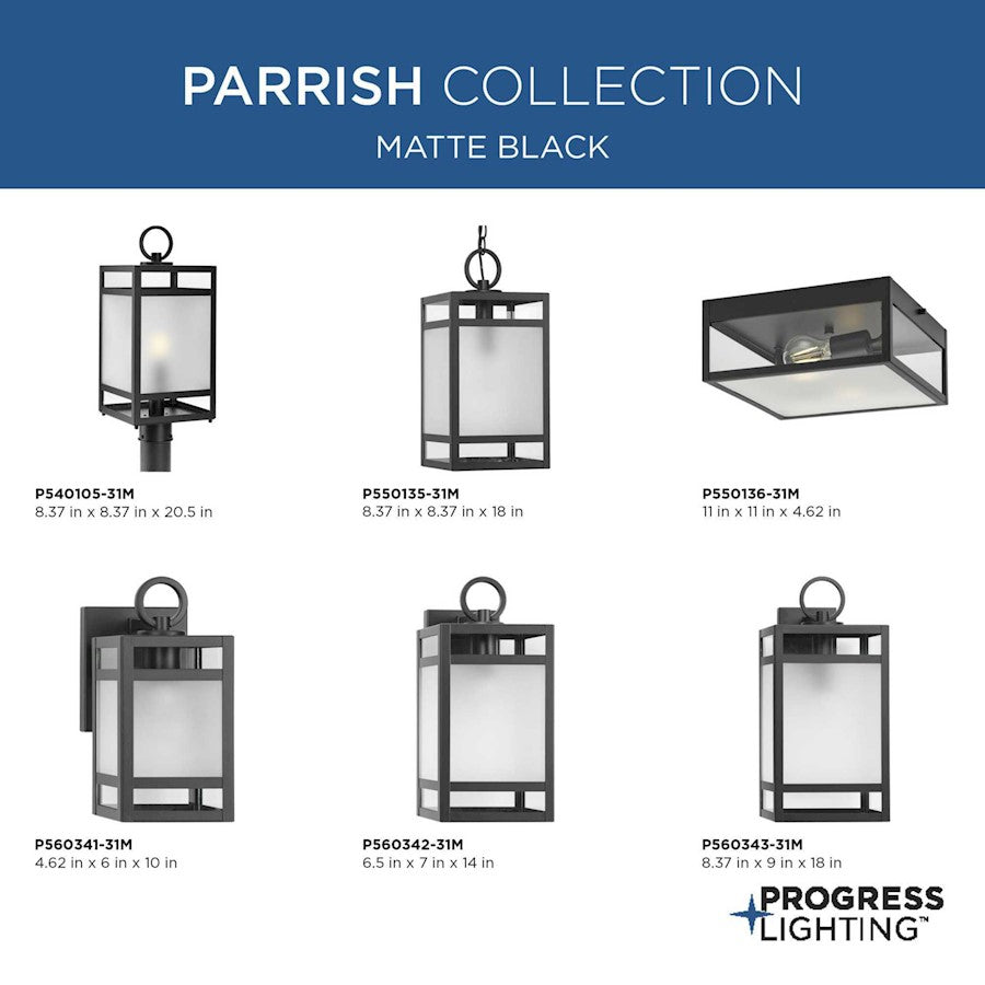 - The Parrish Collection combines classic style with minimalist geometry to impart a modern appeal to outdoor settings in transitional and modern craftsman style homes. This flush mount light features a sturdy, rectangular frame coated in crisp matte black and casts light through etched and clear Glass panels, offering distinctive accents and softened illumination. It is cULus damp location listed for use where water may be present, with a one-year warranty to guarantee your complete satisfaction. Progress Lighting products are designed for exceptional quality, reliability, and functionality.