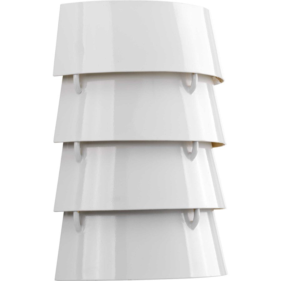 Tiers of metal overlap in a half circle reminiscent of row upon row of gentle waves lapping the shoreline.; Industrial details include a sleek design, and steel pinnings attaching the rows of metal on the body of the fixture, allowing for the light source to subtly gleam between each row.; Inspired by the weathered terrain of the Malibu, California coastline where the designer makes his home.; Perfect for mounting in a bedroom on either side of the bed, dining rooms to accent pendant lighting, in hallways, living rooms, kitchens, and other spaces where balanced lighting is needed to provide task lighting or overall, general illumination.; Surfrider works well across several style palettes.; Coastal, with the inspiration of waves on the shore adding a calming and relaxed feeling to a room.; Modern, as its clean, crisp lines fit well with minimalist décor.; Urban Industrial, as the use of galvanized steel lends a sense of unfinished rawness adding an element of industrial chic to the room.; Finished in a crisp white for a glossy reflective surface, adding glowing highlights when the fixture is lit.; Slim profile depth of 3.875 in. is ADA compliant and perfectly proportional to its height of 11.125 in.; Use two 60w max. medium candelabra base incandescent or LED bulbs (bulbs not included).Height To Center: 6 in
