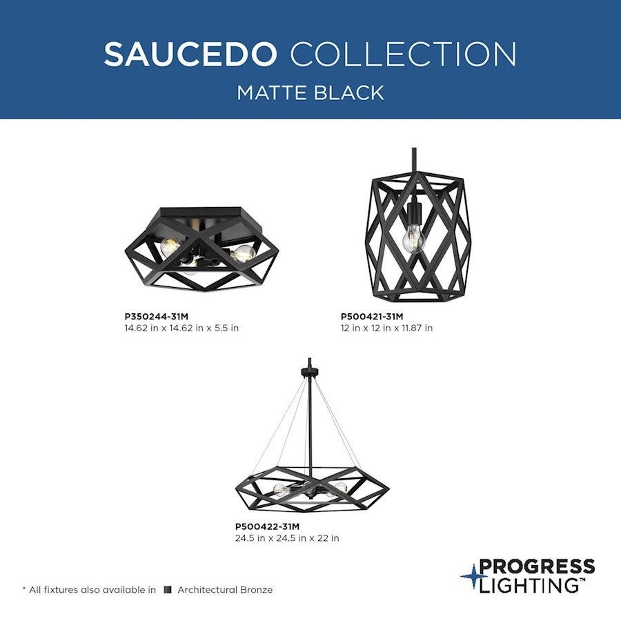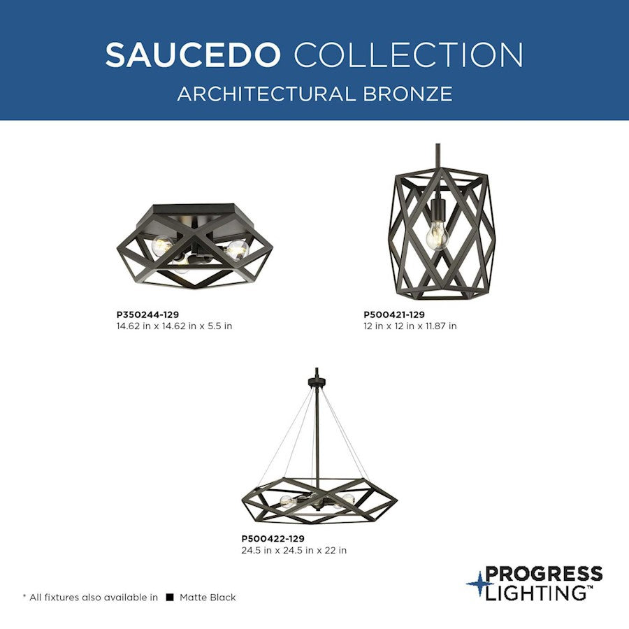 - Dimension and depth define the artful architectural texture defining the Saucedo Collection. Inspired by an interplay of shadows and geometrical lines complement the shining light source within, elevating contemporary and modern interiors with an artful and distinct taste. Finished in a strong architectural bronze and matte black offer two multi-dimensional finishes enhancing the frame's one of a kind visual appeal in transitional rooms. This fixture is part of the Progress Lighting Design Series, a lighting collection offering fashionable styles and affordable luxury lighting for the home.