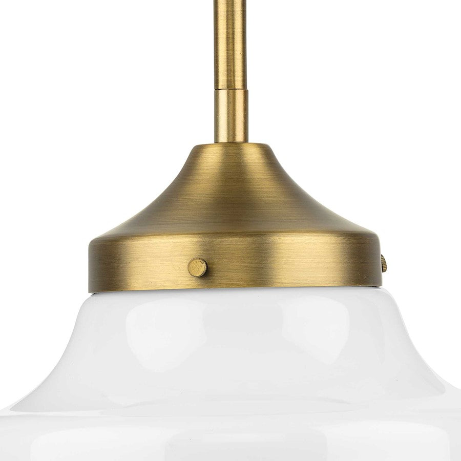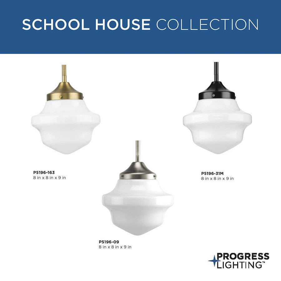 Take a trip back in time with the School House Pendant whose scale is perfect for kitchens, breakfast nooks and bar areas, or hang in multiples over a kitchen island; Distinctive vintage style complements farmhouse and coastal decor; A white opal schoolhouse Glass shade is suspended from a cap and downrod coated in a crisp matte black or beautiful vintage brass finish; Can be displayed singly or in groupings of two or more - such as foyers, entryways, kitchens; Uses (1) 100-Watt maximum, medium base bulbs or LED equivalent, that is sold separately, and dimmable when used in conjunction with a dimmable bulb; Measures 8-in. width by 9- in. height; Includes one 6", four 12" stems and 6 links of chain for a variety of mounting types and sloped ceiling; Warranty: Our 1-Year Limited Warranty guarantees your complete satisfaction with your purchase and includes professional after-sales customer service support; Includes installation instructions and mounting hardware for a quick, easy installation; Progress Lighting products are designed for exceptional quality, reliability, and functionality; Progress Lighting products are designed for exceptional quality, reliability, and functionalityOverall Height: 75