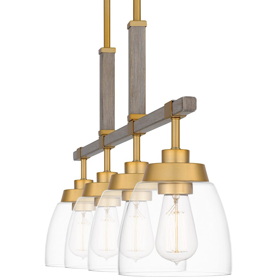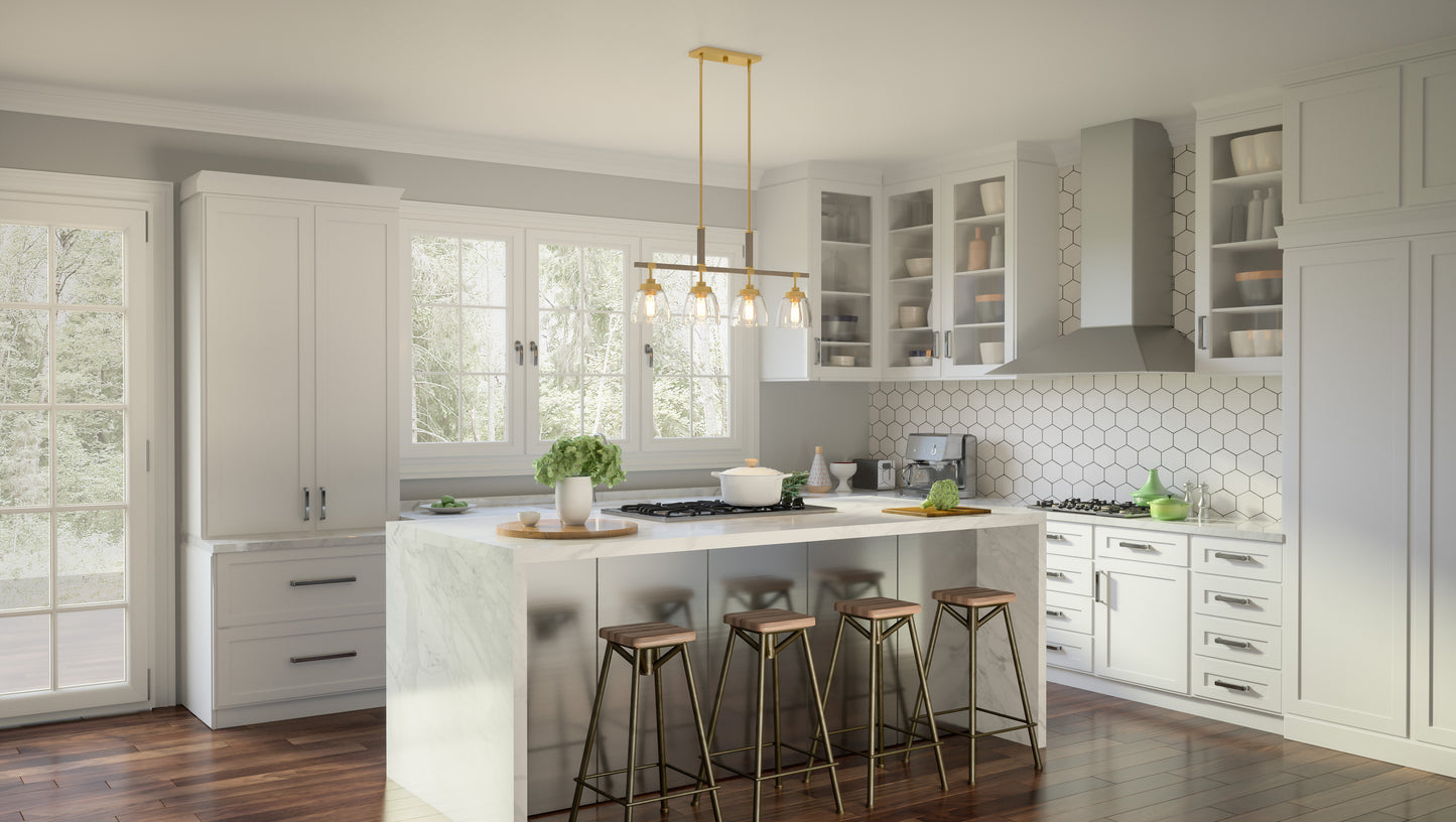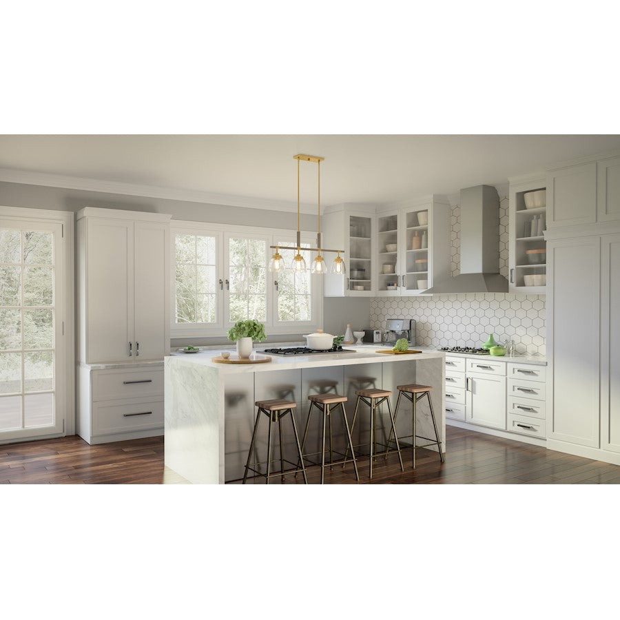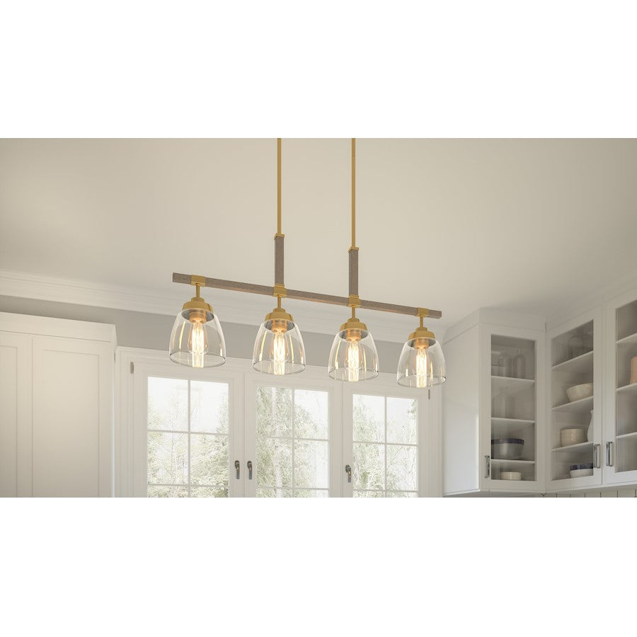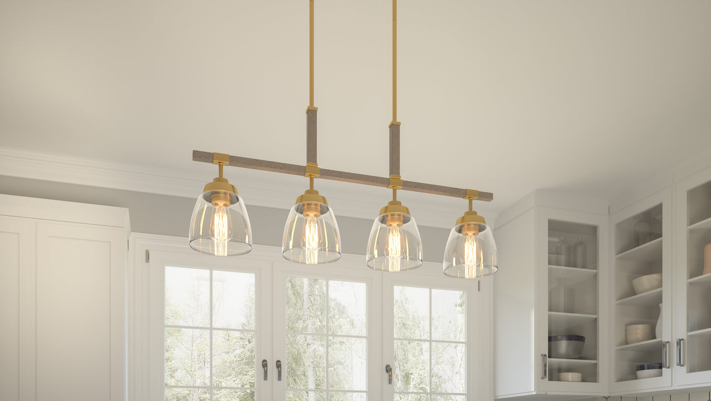 A light gold finish sets the tone for Burkett’s weathered wood details and clear elements. The effect is fresh and fashionable, but with a subtle nod to nature. This combination of materials proves incredibly versatile, too — Burkett is available as a mini pendant, semi flush-mount, island light, or chandelier.