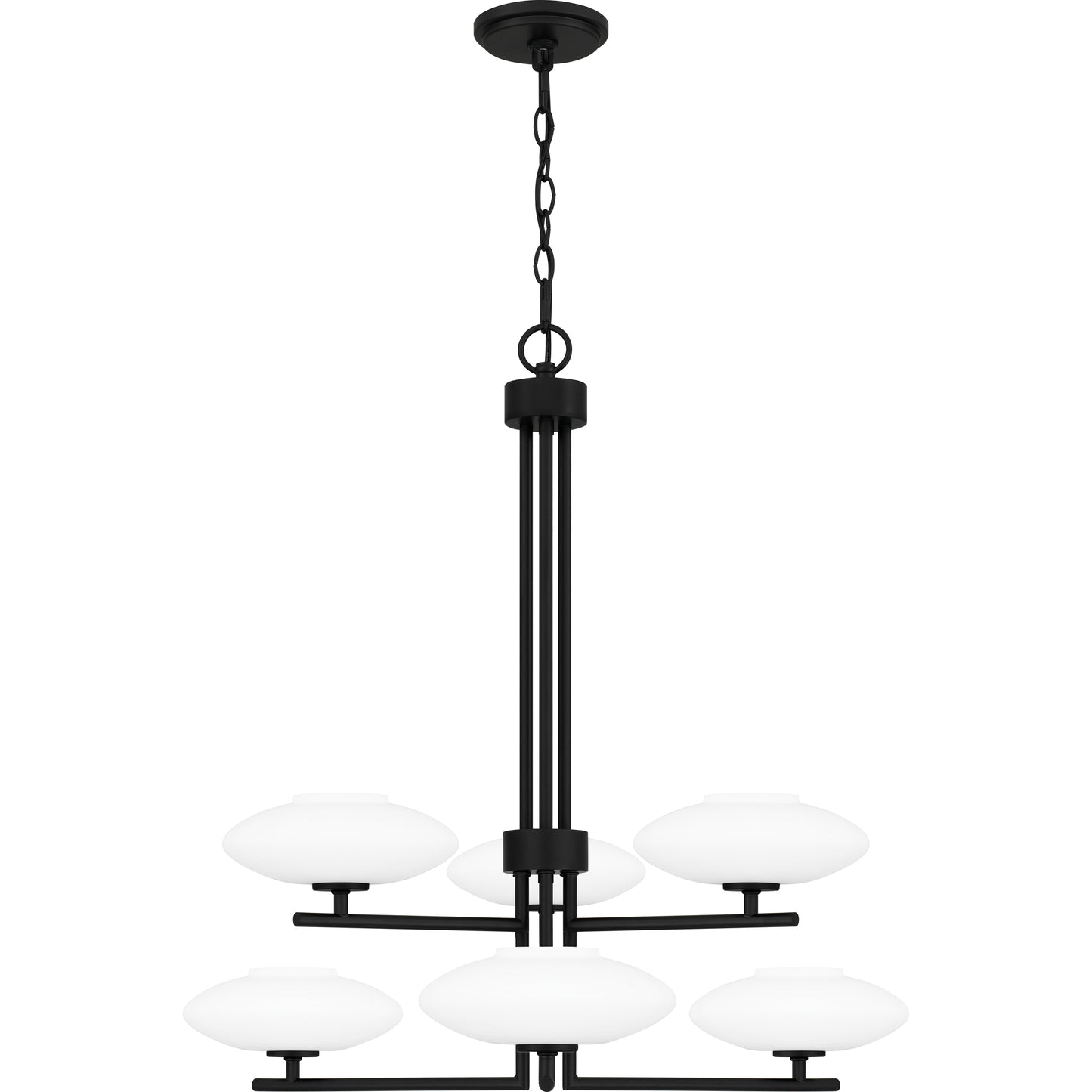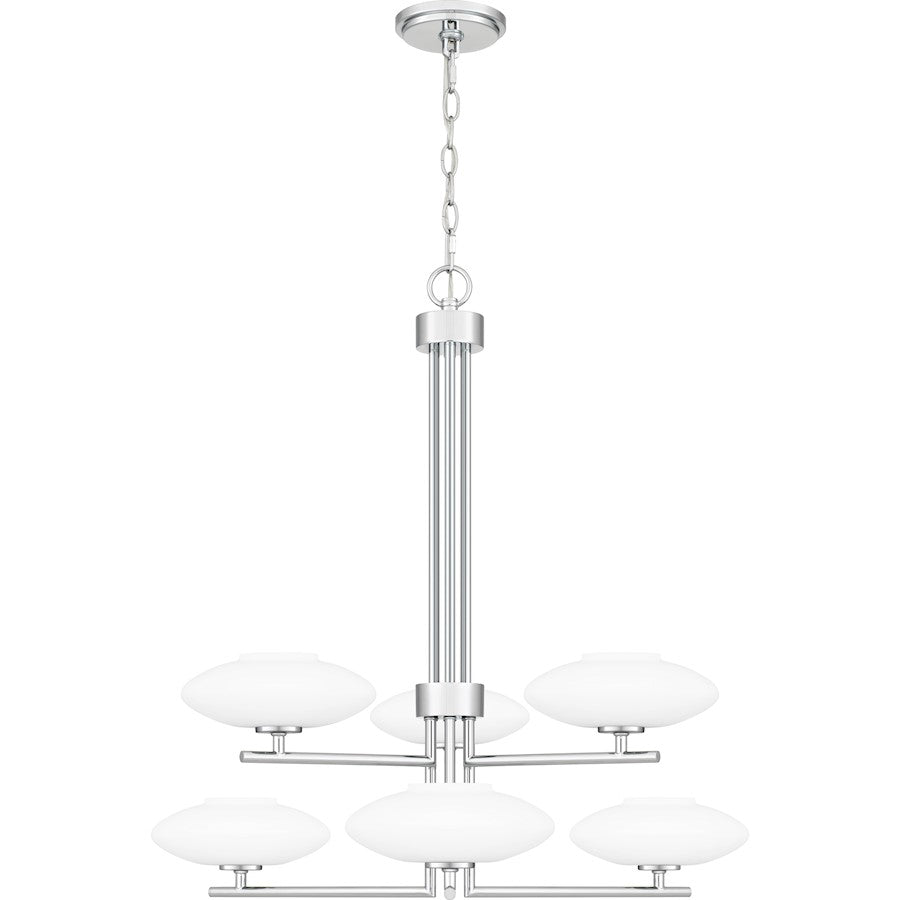 Select a finish that best suits your space with the Chenal chandelier. Aged brass creates warmth, polished chrome adds glamour, and matte black offers a grounding effect. Milky, opal etched glass shades complete the look.