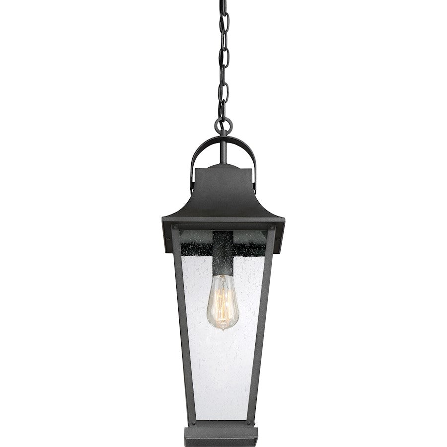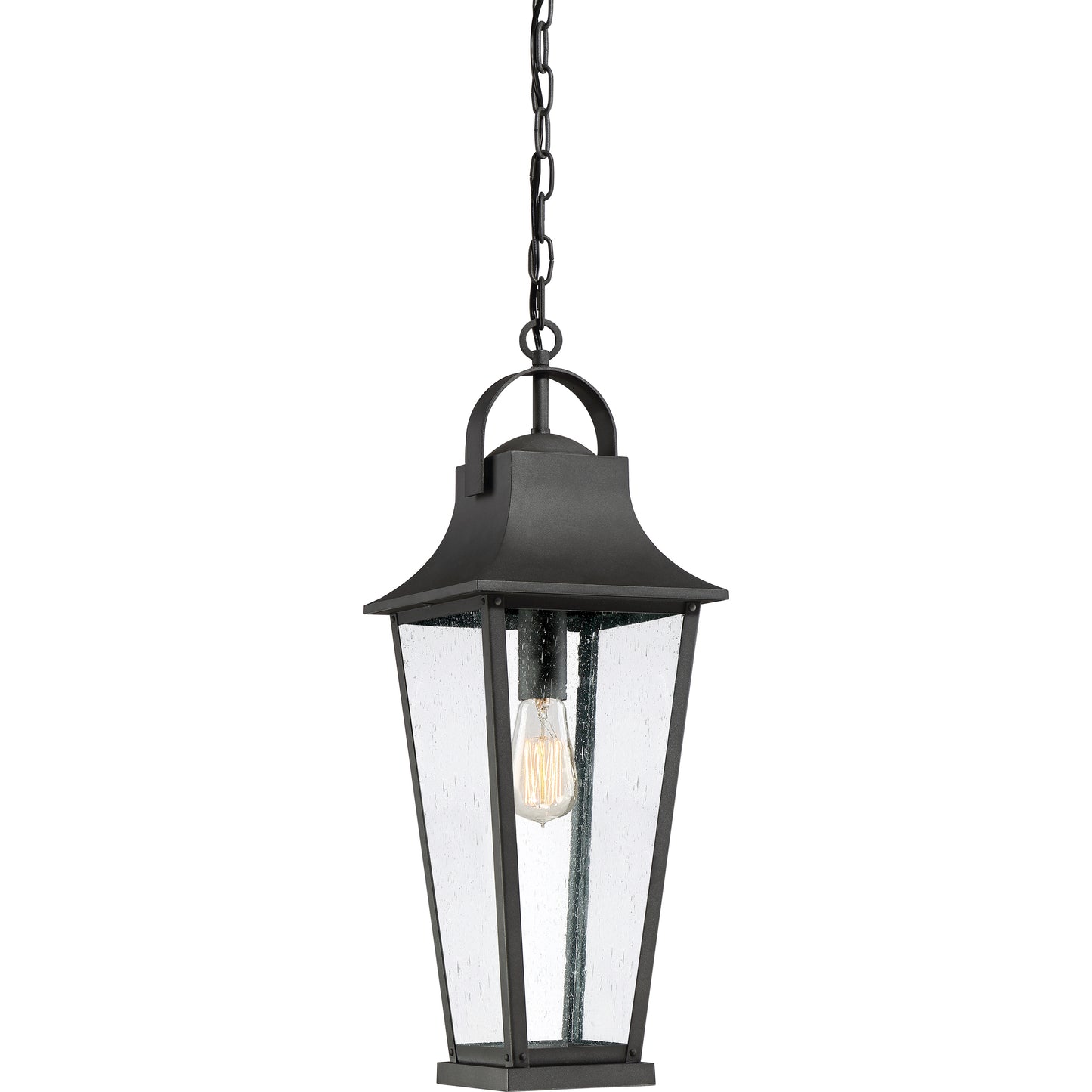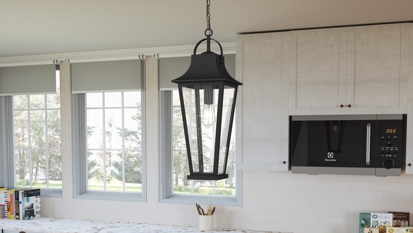 Galveston is a beautifully crafted addition to any home. Its gently tapered frame and classic top loop add to the collection's versatility, while the mottled black finish and clear seedy glass panels showcase the beauty of the exposed bulb socket. Hang indoors or outdoors, and add in a vintage filament bulb for an extra layer of flair (not included).