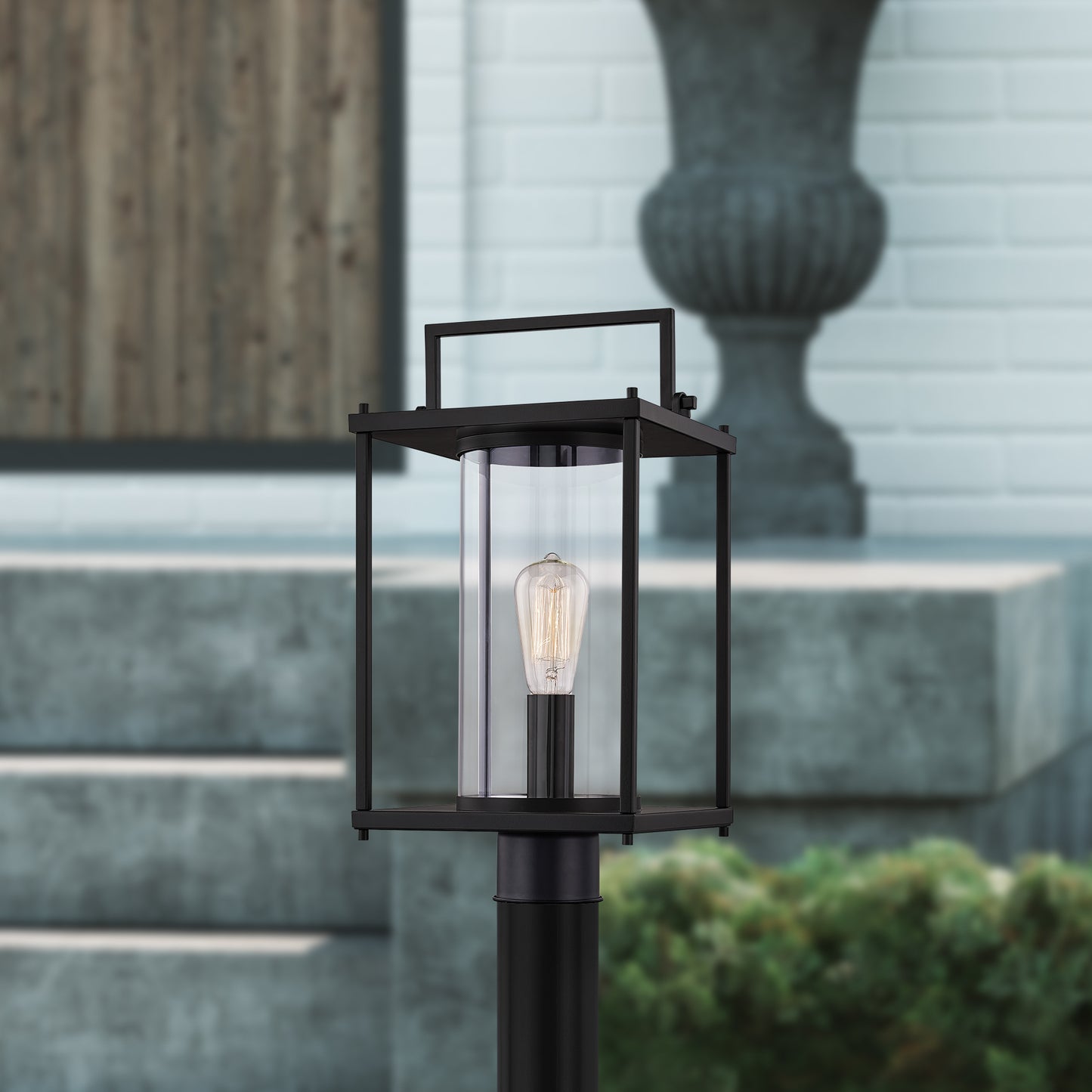 The Garrett collection will instantly enhance the exterior of your home. The minimalist design with clean, thin lines creates a modern look that you and your guests are sure to enjoy. The open frame is crafted from steel, finished in Matte Black and contains a clear cylindrical glass shade for a unique design element.