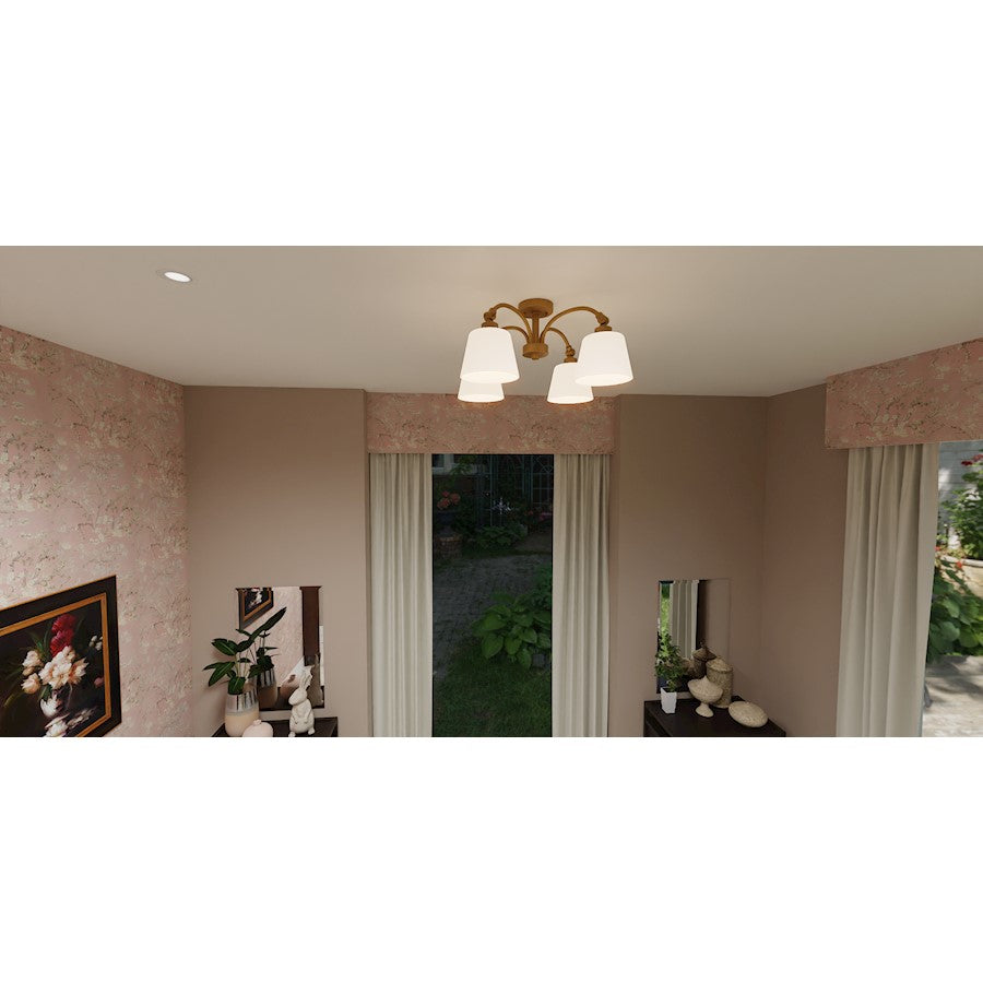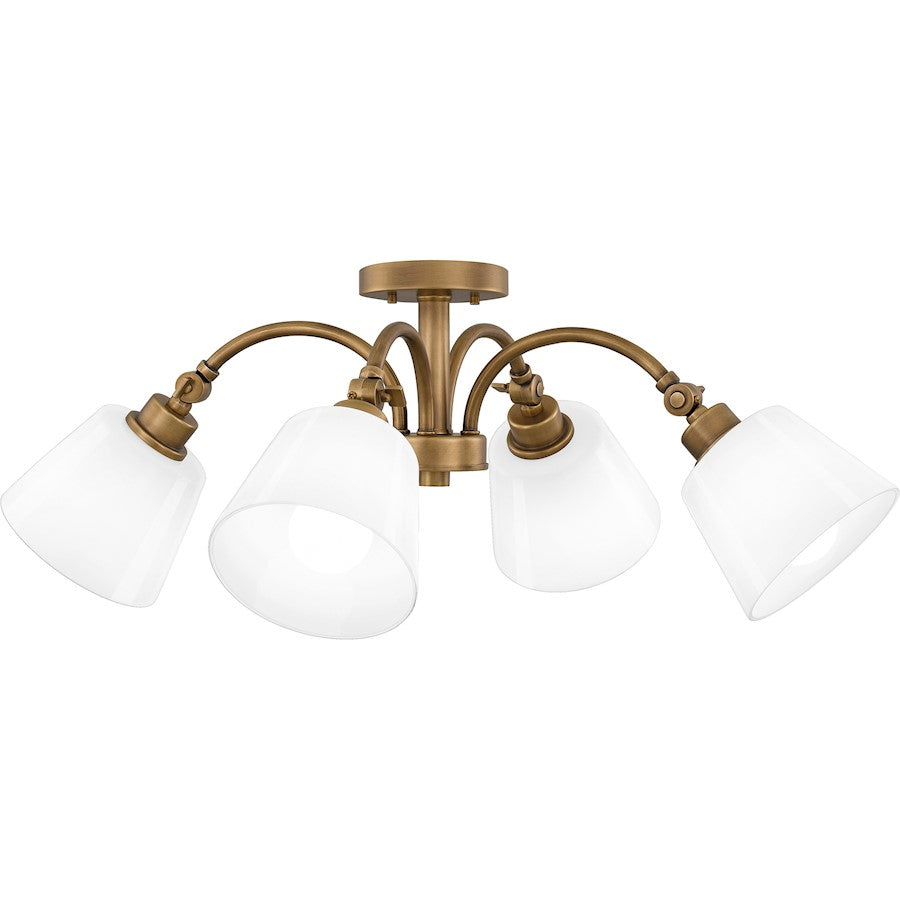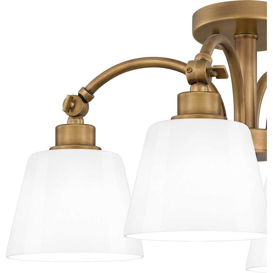Classic meets transitional in the Iota semi-flush mount. A simple weathered brass frame is accentuated by unique joint accents, adding a touch of modern industrial style. Opal glass shades complete the timeless look, emitting a warm ambient glow in a breakfast nook, kitchen, home office, or over a small table.