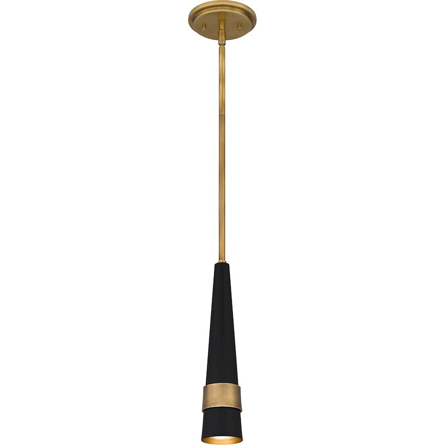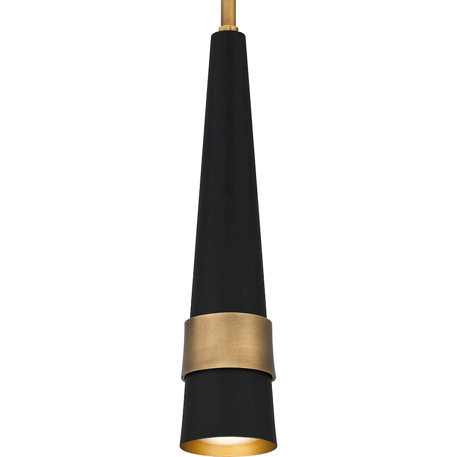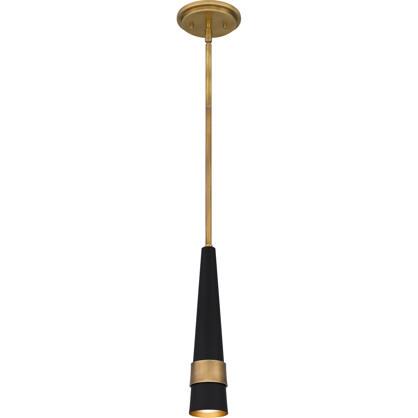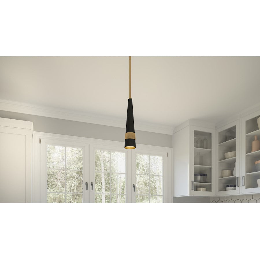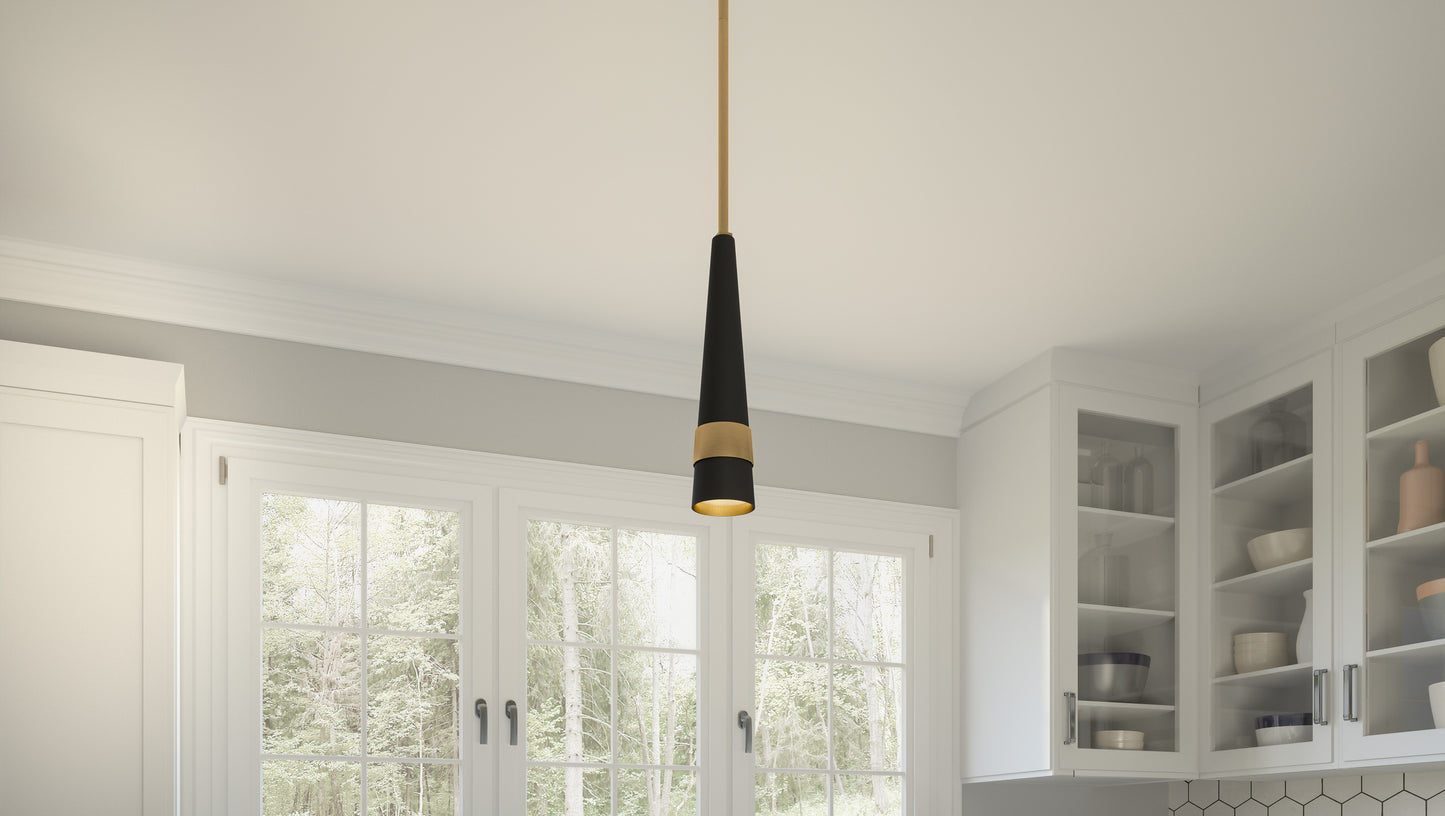 Meet the slim, sultry lines of Lennox. This black mini pendant includes integrated lighting for dependable, continuous illumination. A weathered brass finish provides a luminous glow.