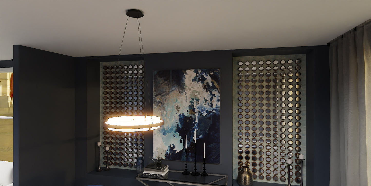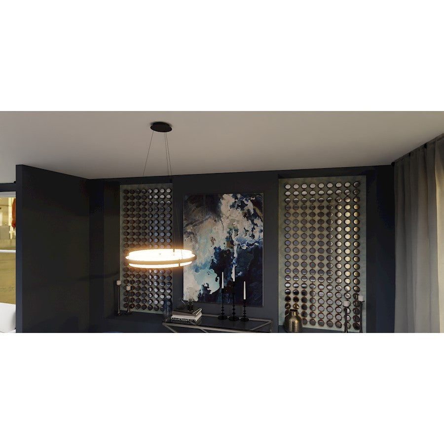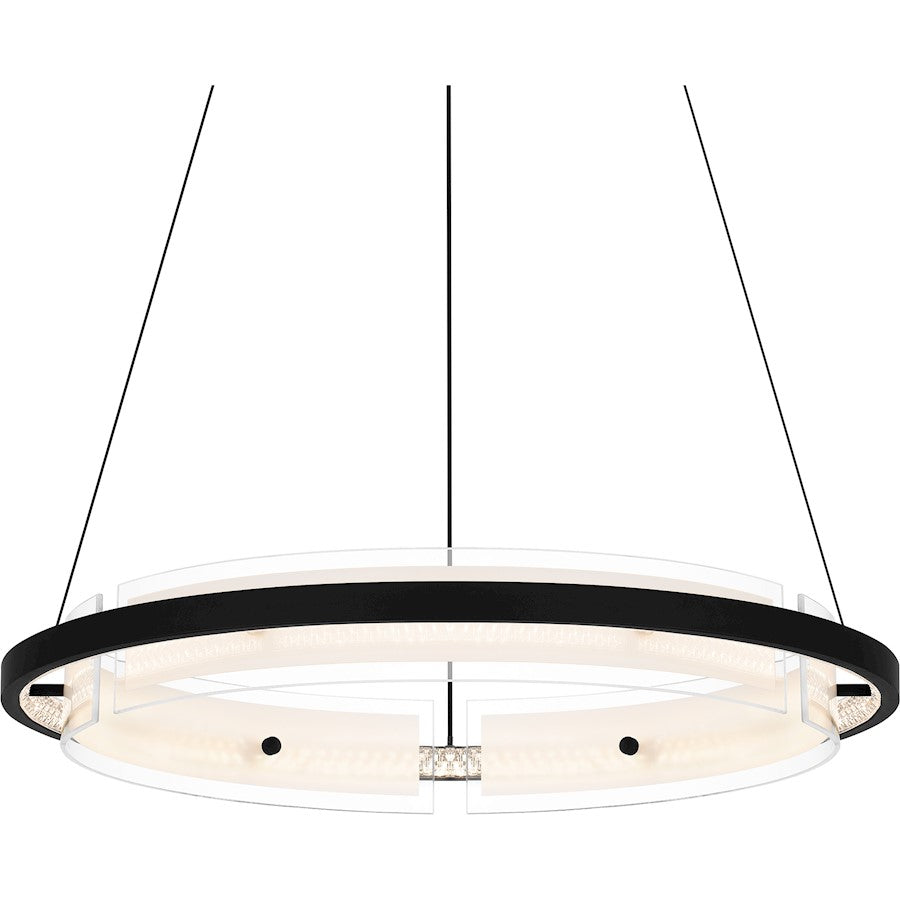 Simple construction and minimal styling elevate the frosted glass detail of Malik. A clean and contemporary ring defines the pendant, featuring a matte black finish for a sharp contrast. An integrated LED light source shines through the clear shade, sparkling brilliantly as it touches each frosted glass accent.