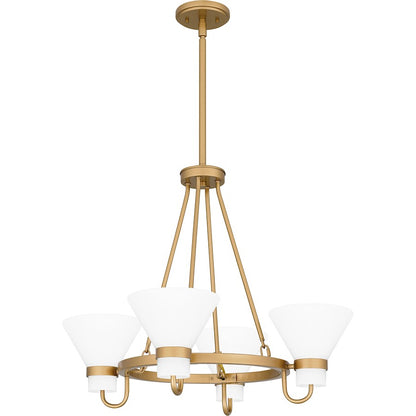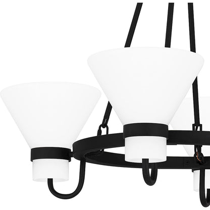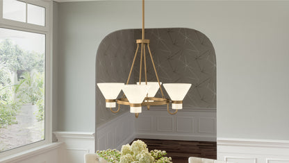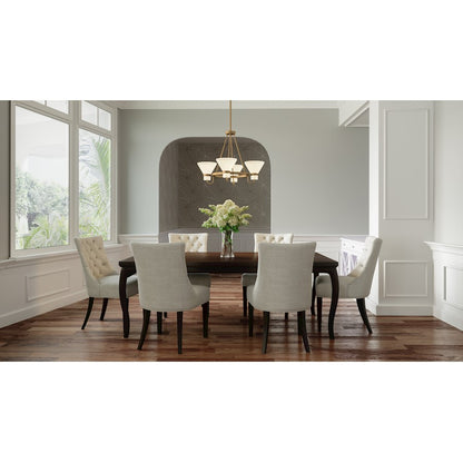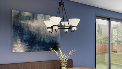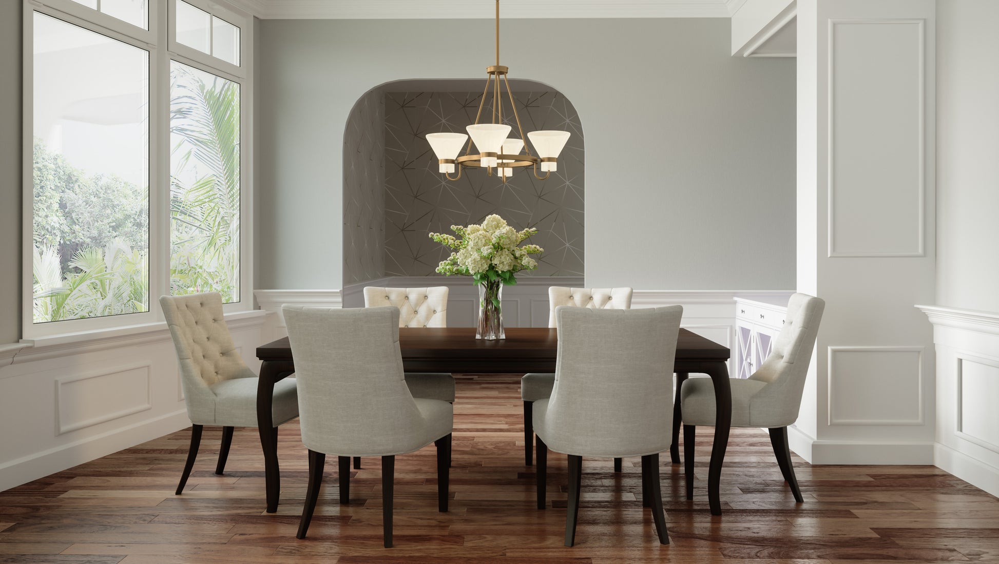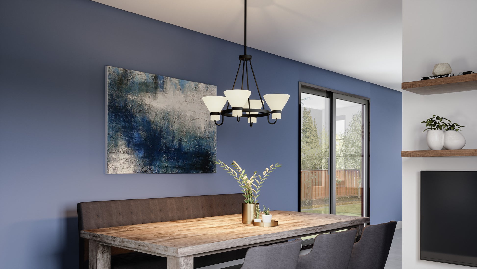 A fresh interpretation of Mission style, the Marigold chandelier features opal etched glass that softly casts light. Whether in earth black or painted modern gold, this piece anchors dining room style. Upward-facing shades maximize diffuse light.