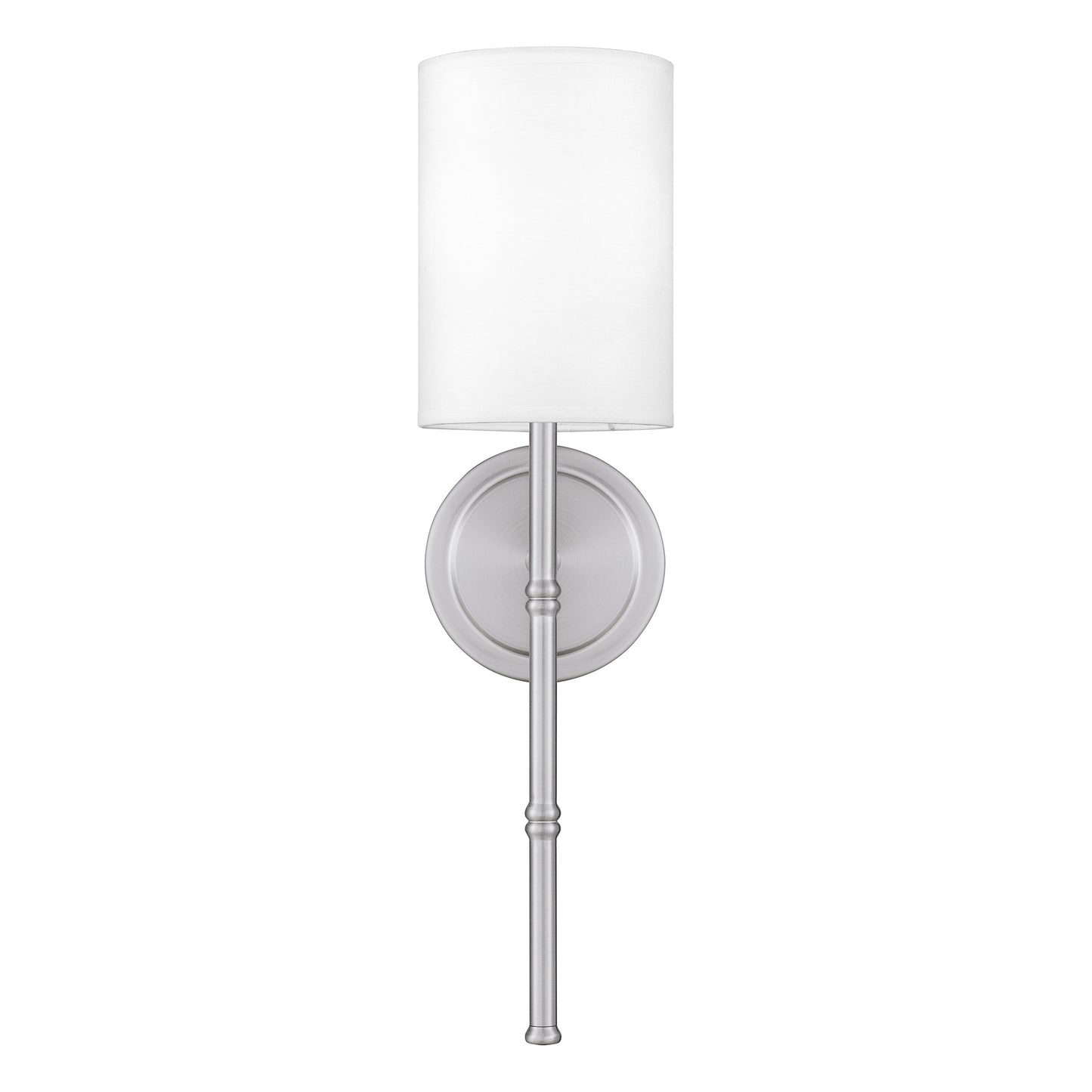 - White fabric shade adds depth and texture