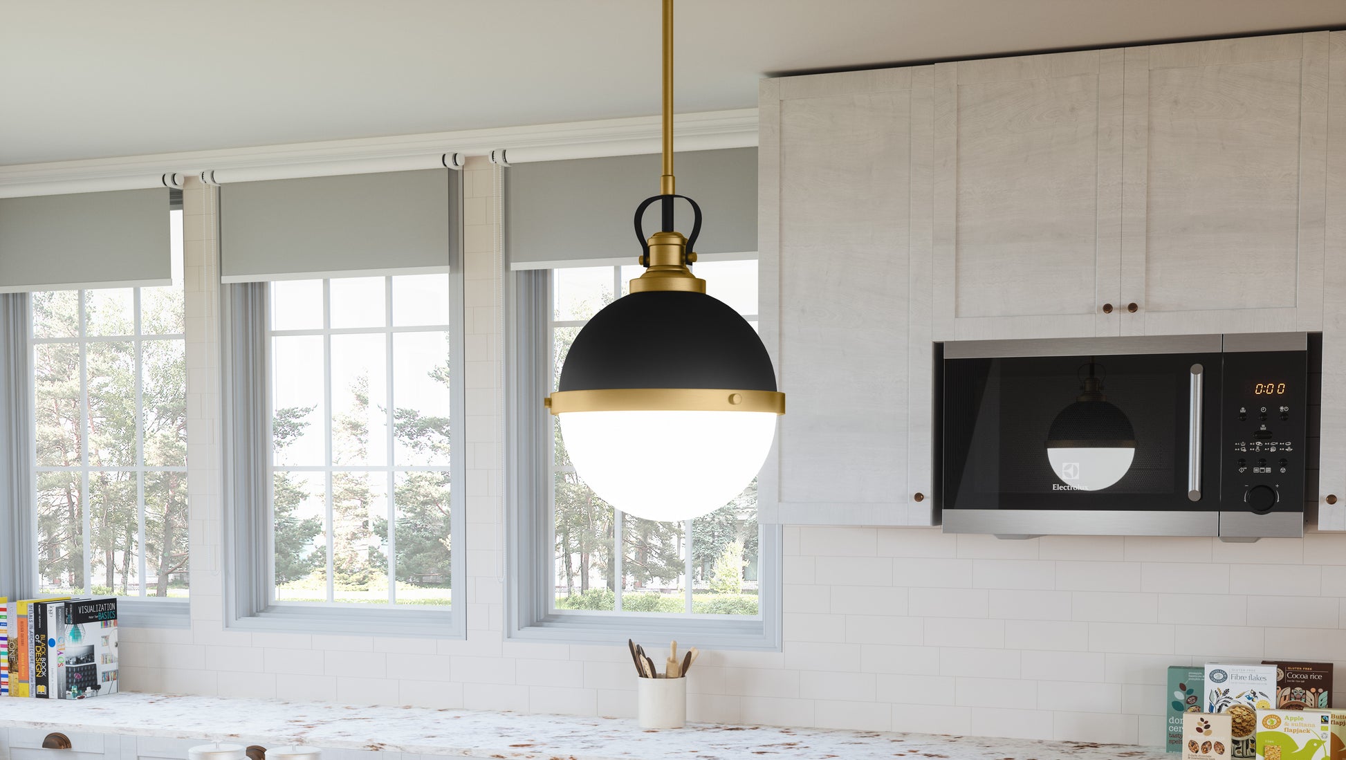 Sullivan’s spherical shape packs aesthetic punch. This handsome pendant features an opal-etched glass shade paired with a matte black finish and brass trim. Try a trio of these lights in the kitchen, or use one on its own in the foyer.