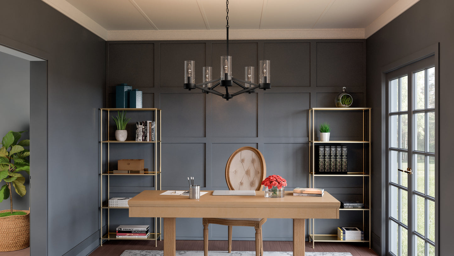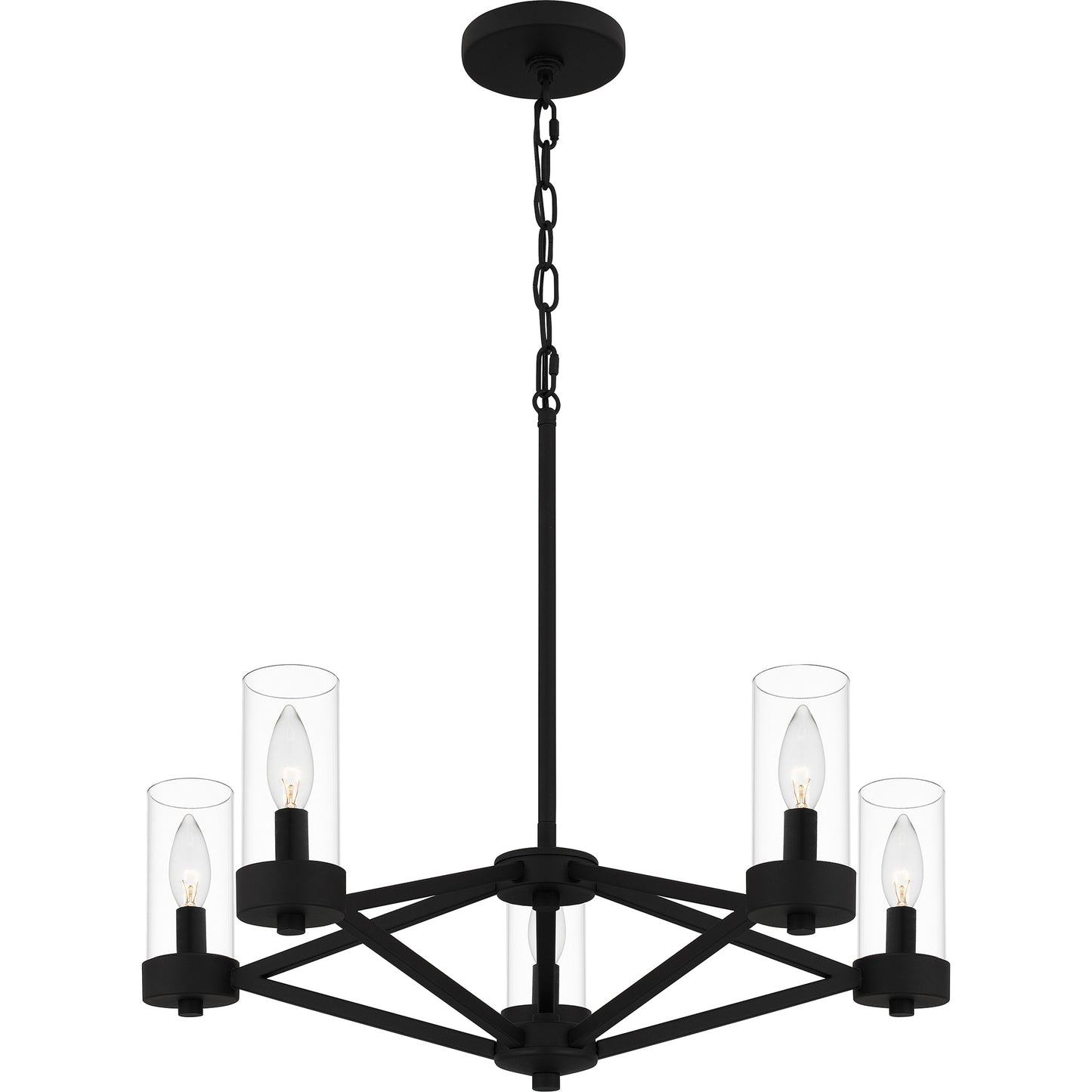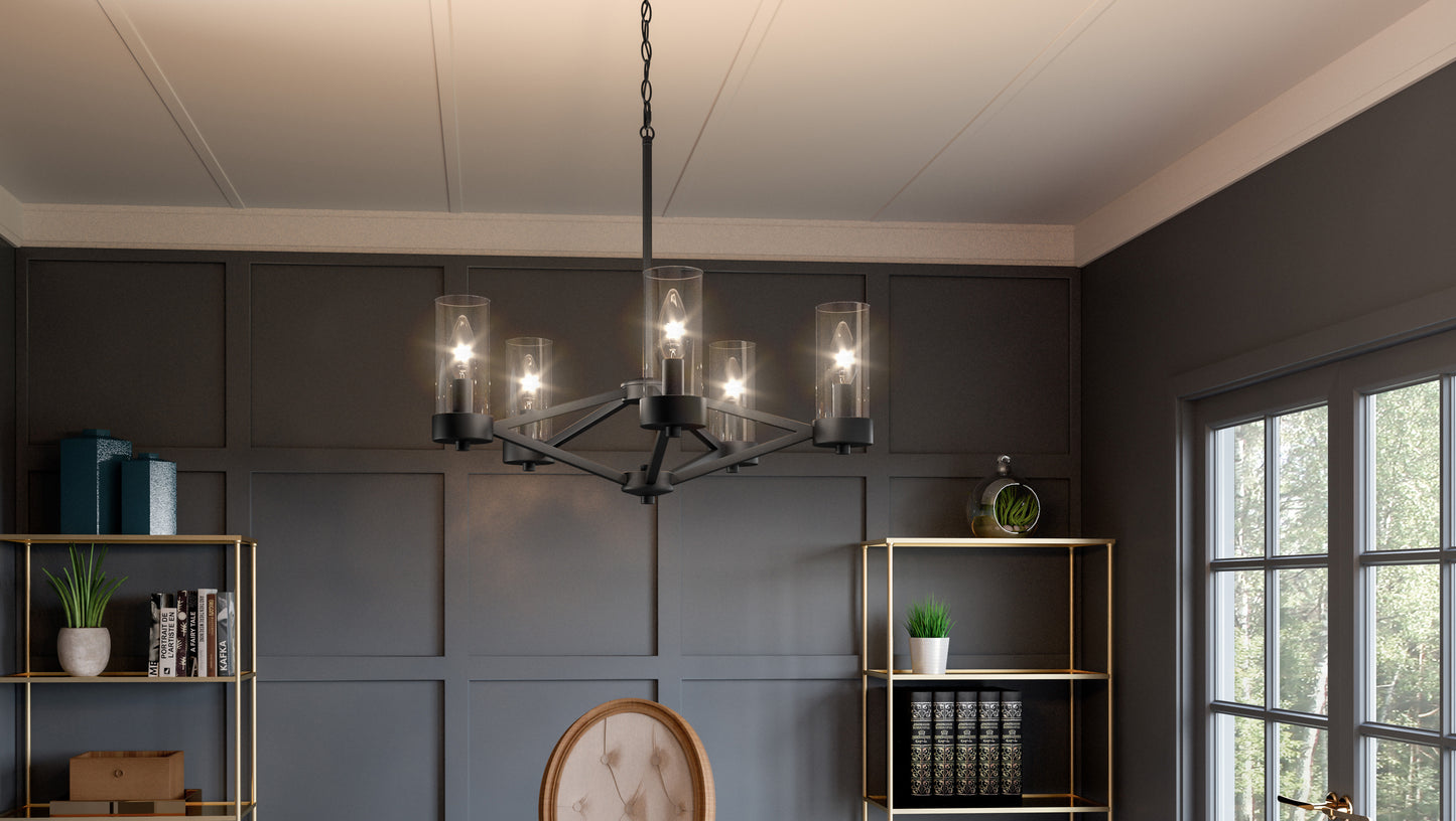 Earth black and clear glass are a clean and classic pairing. The Villa five-light chandelier is a true standout piece with its sleek angled lines and industrial-inspired accents. This timeless design is suited to a wide range of interior aesthetics. Illuminate enduring style over a variety of kitchen or dining room tables.