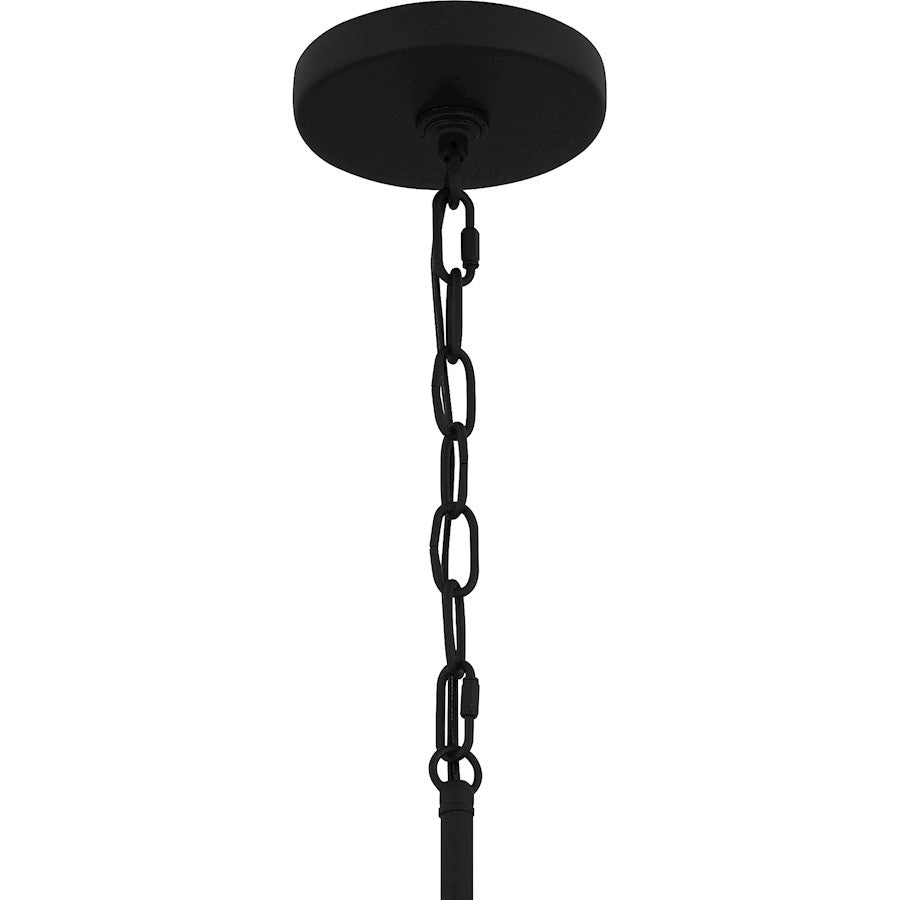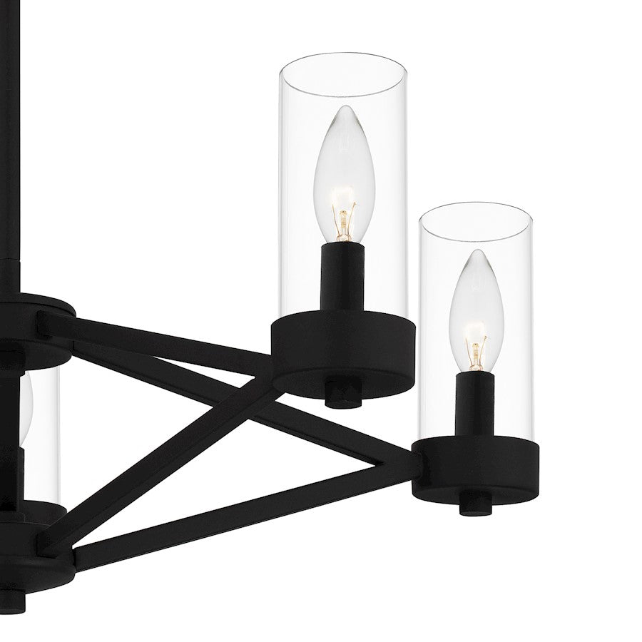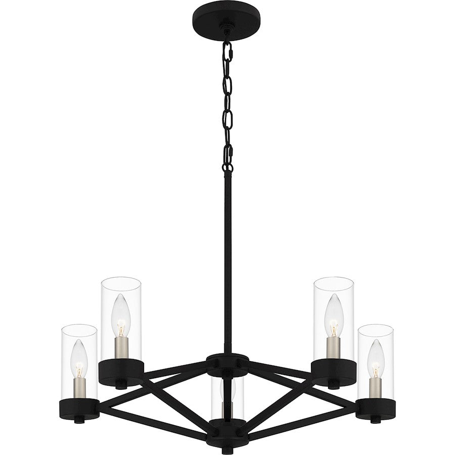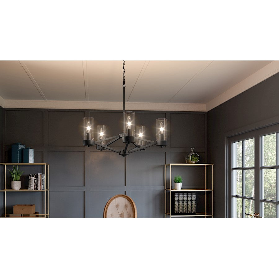 Earth black and clear glass are a clean and classic pairing. The Villa five-light chandelier is a true standout piece with its sleek angled lines and industrial-inspired accents. This timeless design is suited to a wide range of interior aesthetics. Illuminate enduring style over a variety of kitchen or dining room tables.