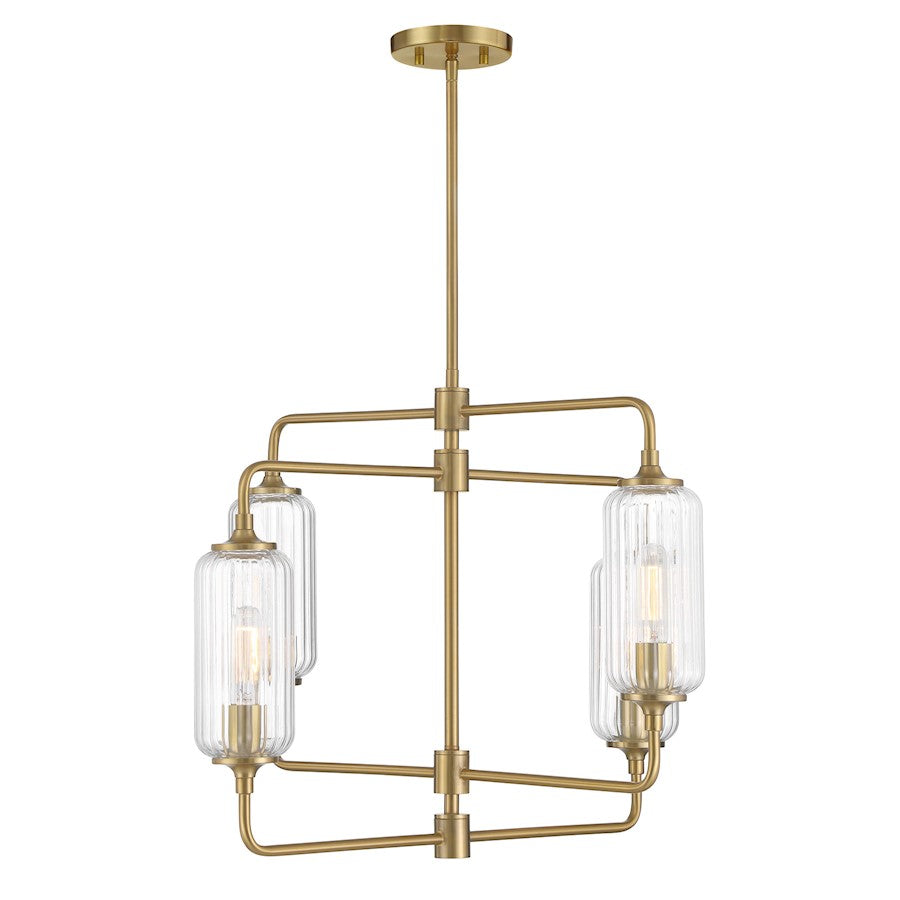 The Savoy House Holton 4-light chandelier showcases an inventive and geometric style with tall, rounded shades of clear ribbed glass and a slim, rounded structure finished in Warm Brass. It will bring a big dose of style to any space! Holton is 26" in width and has an adjustable height ranging from 20.25" to 74.25". It uses four standard size bulbs of up to 60 watts per bulb. Bulbs not included. Comes with four 12" downrods and one 6" downrod.