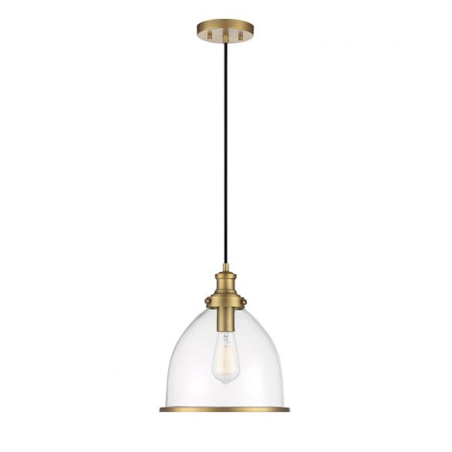 Looking for vintage-inspired lighting style? Look no further than this Meridian 1-light pendant! It flaunts a clear glass shade with natural brass detailing that goes perfectly with the black hanging cord. This pendant would look great flying solo or as part of a grouping. 12" height, 11" width. Max height 132". Max 60 watt bulb, standard size A19 bulb recommended. LED bulb compatible. Supplied with 120" of cord.