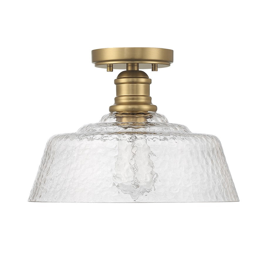 Bring a bold touch of vintage industrial style to any space with this 1-light ceiling light. It features a highly textured shade of glass, eye-catching detailing and a natural brass finish. 9.19" height, 13" width. Uses standard size bulb, max 60 watts. LED bulb compatible.