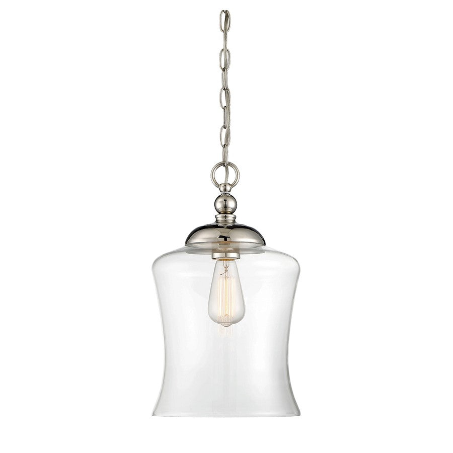 This 1-light pendant showcases a curving shade of clear glass and is finished in Polished Nickel. 16.5" in height and 9.75" in width.