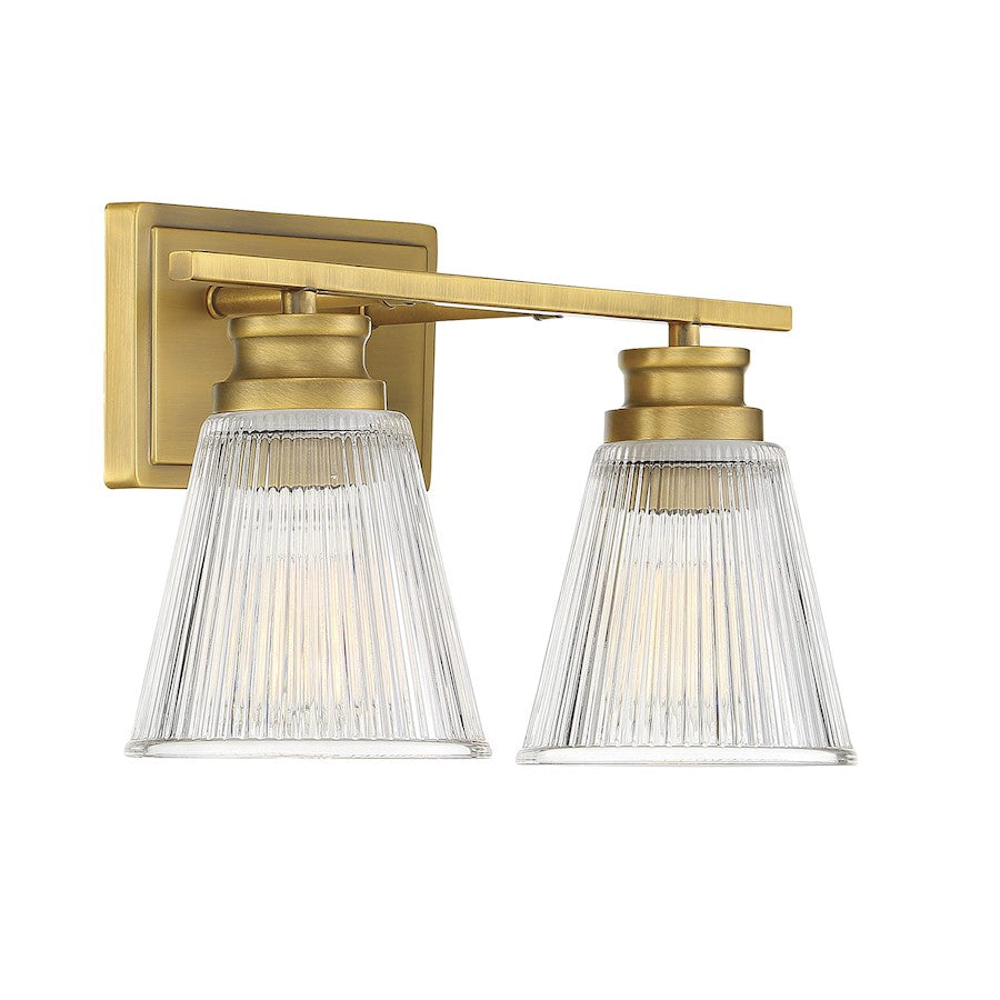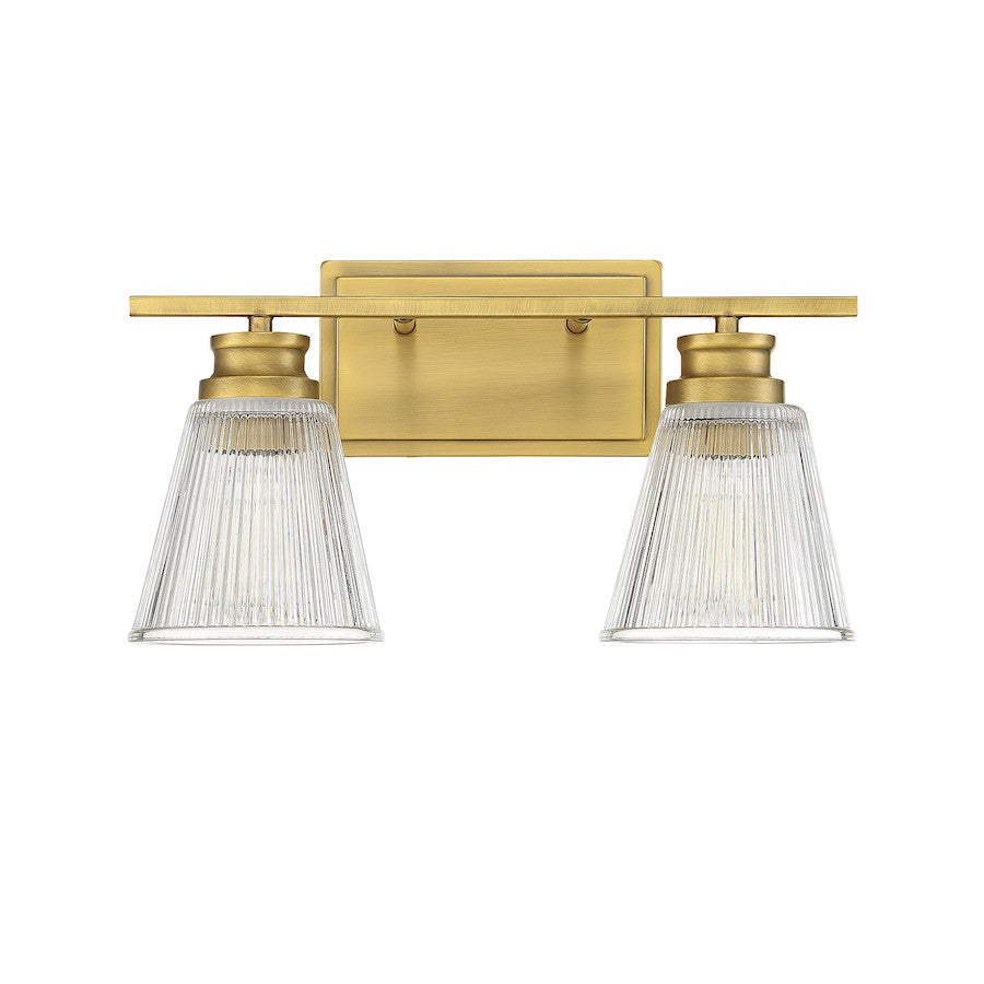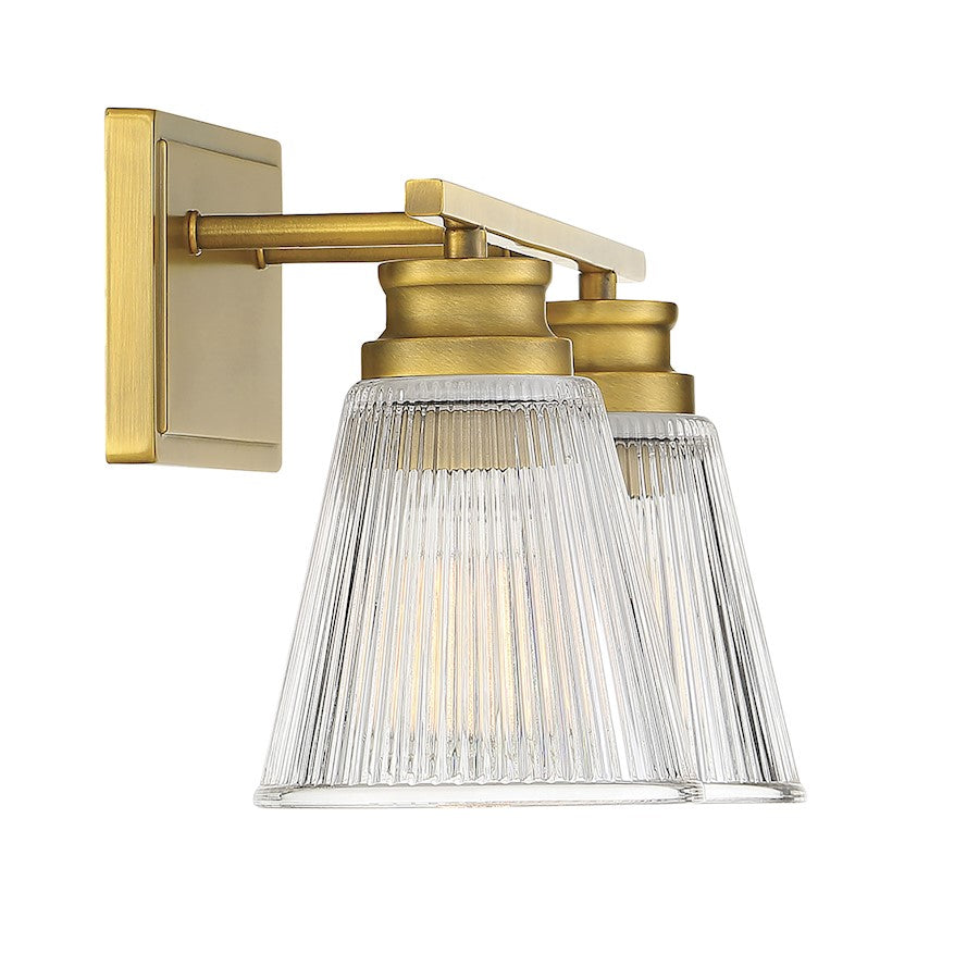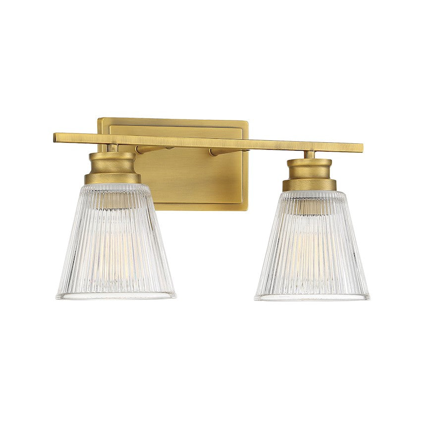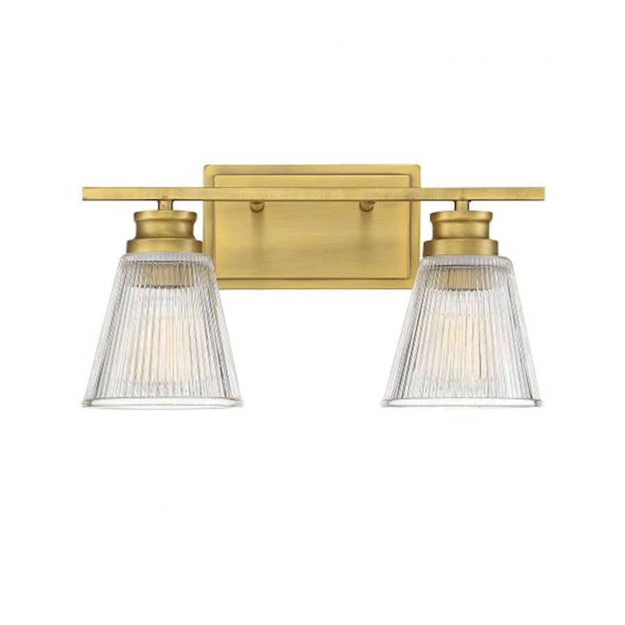 Bring the effortless look of vintage-inspired style to any bathroom vanity with this 2-light bath light. It has a sleek and uncomplicated design, adorned with vintage-style clear ribbed glass shades and finished in natural brass. Can be used with shades facing up or down. 8.75" in height and 16" in width. Extends 7.5" from the wall. Uses 2 standard size bulbs of up to 60 watts per bulb, is LED compatible and is dimmable.