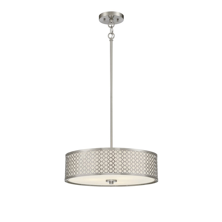 Classic lighting style gets an eye-catching upgrade in this 3-light Meridian pendant. Its sleek drum-shaped white fabric shade is decorated with a metal pattern finished in brushed nickel to create another dimension of texture and interest. Use this pendant alone or in multiples to brighten up rooms with modern, contemporary or transitional styles. This pendant is 5" in height and 18" in width, plus it includes four 12" downrods and one 6" downrod to let you adjust the height for a maximum of 59". This pendant uses 3 medium size bulbs of up to 60 watts each, is LED compatible, is dimmable and can be used on a sloped ceiling.