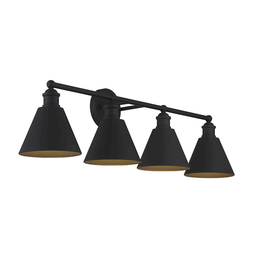 This totally matte black Meridian 4-light bath vanity light is sure to add dark drama to any bathroom. From the backplate to the bottom of the metal shades, everything on this sconce brings a big dose of inky intrigue. 10" height, 37.5" width, extends 9" from the wall. Max 60 watts per bulb, standard size A19 bulbs recommended. LED bulb compatible. Damp area rated.