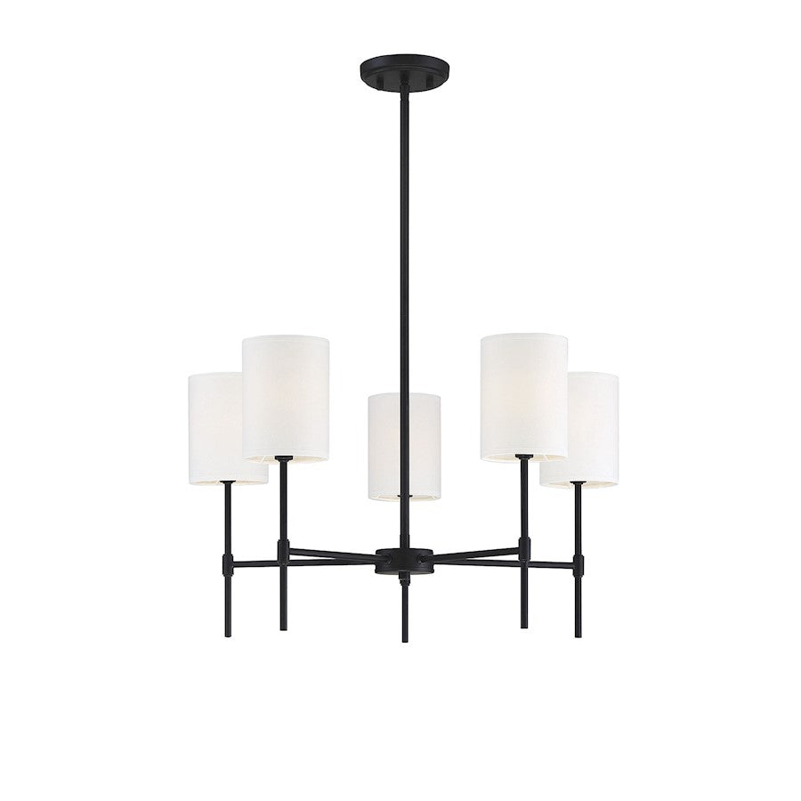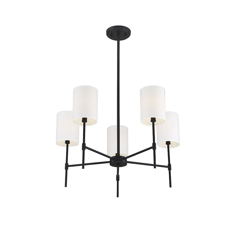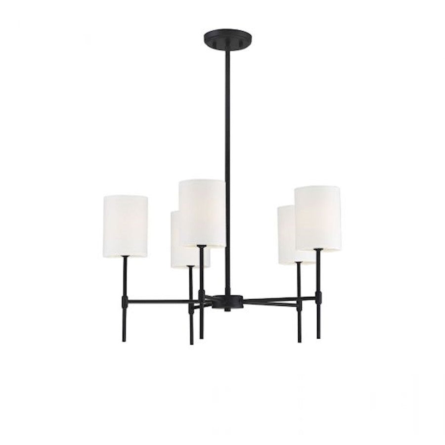 Bring an understated yet bold lighting look to your home with this sleek 5-light chandelier. It features long, tall arms topped by white fabric shades and finished in matte black. It’s the perfect way to brighten up and perk up the style of any room. It is 15" in height and 25" in width, plus it includes four 12" downrods and one 6" downrod to let you adjust the hanging height for a maximum of 61". It uses 5 candelabra size bulbs of up to 60 watts per bulb, is LED compatible and is dimmable.