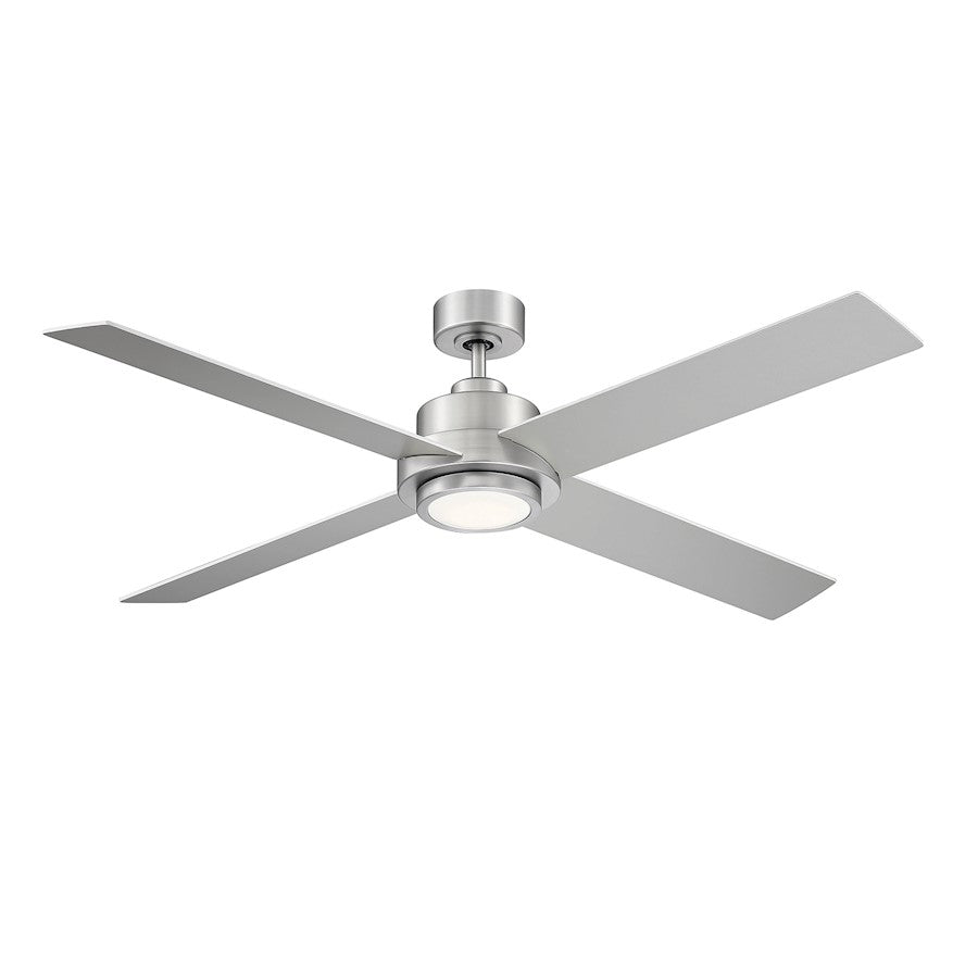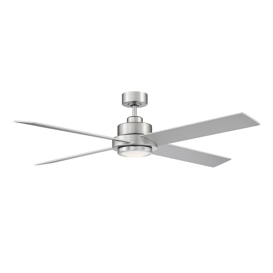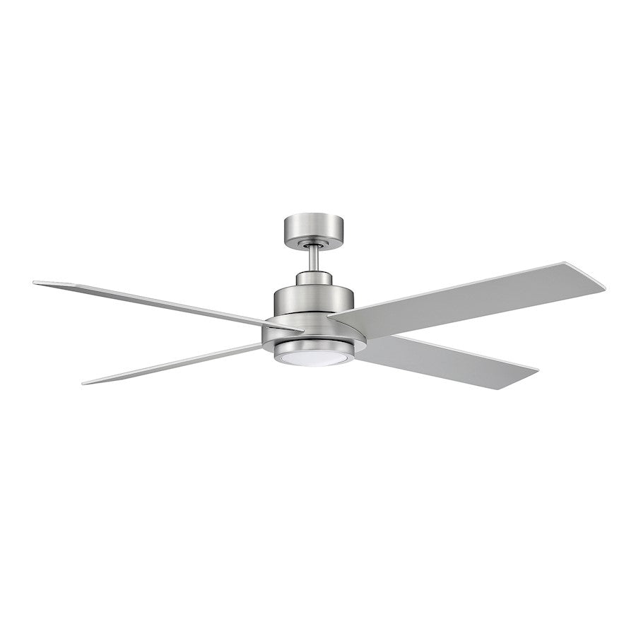 Stay comfortable in style with this contemporary 56" ceiling fan from Meridian! It features four blades and a sleek brushed nickel finish, creating a look that is perfectly suited for rooms with contemporary, modern and transitional styles. This fan is damp area rated, so it may be used in covered outdoor rooms like porches or patios in addition to indoors. It also includes an integrated dimmable 18-watt LED light that gives off 1400 lumens with a color temperature of 3000K. Plus, the fan comes with a remote control for added convenience! One 4.5-inch downrod is included and additional, longer downrods are sold separately. This ceiling fan is 14.34" in height. Thanks to its 6-speed, reversible DC motor, this ceiling fan is also very efficient. This fan's energy information is as follows: The airflow is 6034.25 cubic feet per minute, the electricity use is 31.83 watts and the airflow efficiency is 189.58 cubic feet per minute per watt.