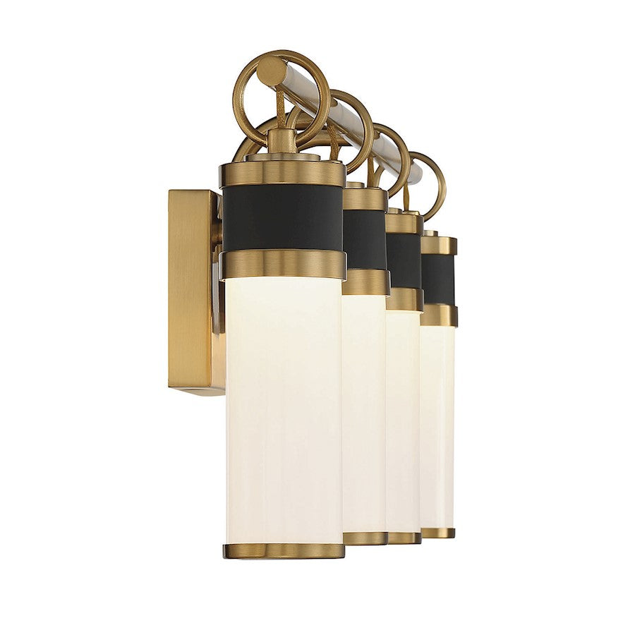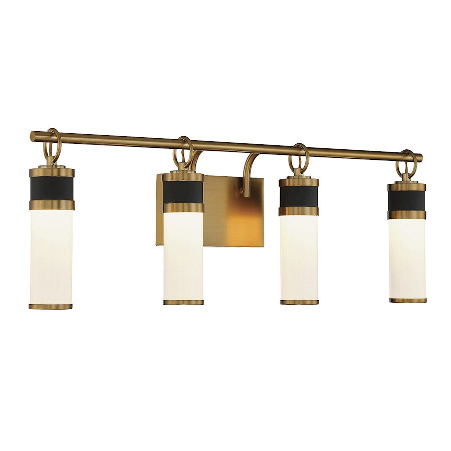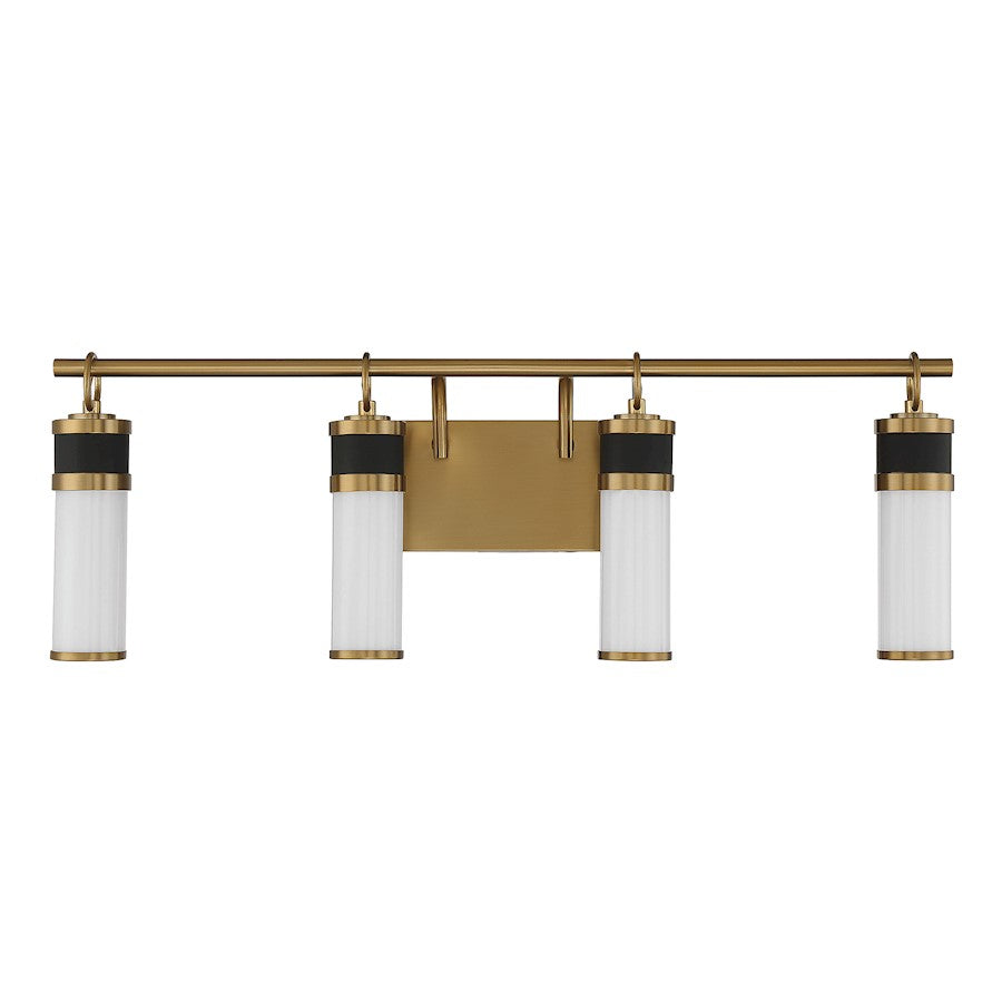 The Savoy House Abel 4-light bath vanity light flaunts a sleek and airy look that creates a robust presence in any space. Tubes of white opal glass are accentuated by ring accents and thoughtful hardware detailing in a rich combination of matte black with warm brass. Integrated LED light sources contribute to the sleek style. Abel is 10" in height, 30" in width and extends 5" from the wall. Damp area rated.