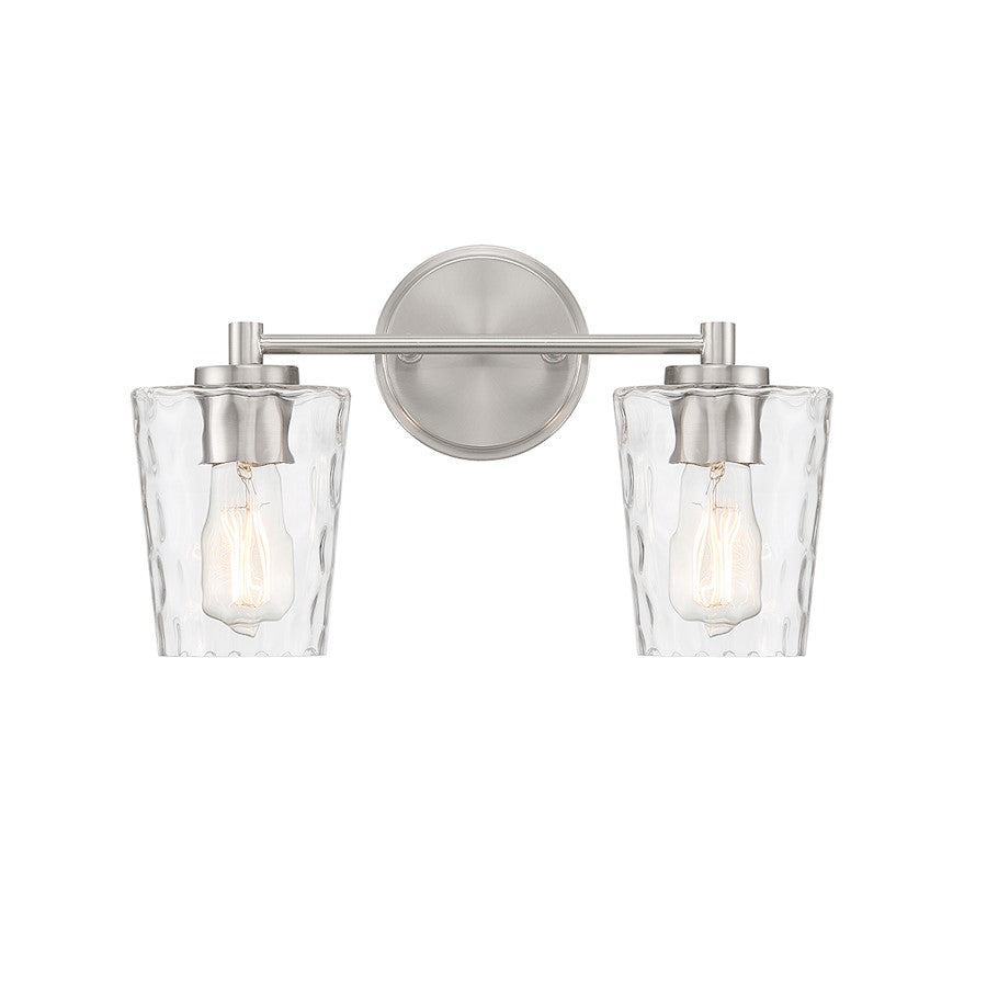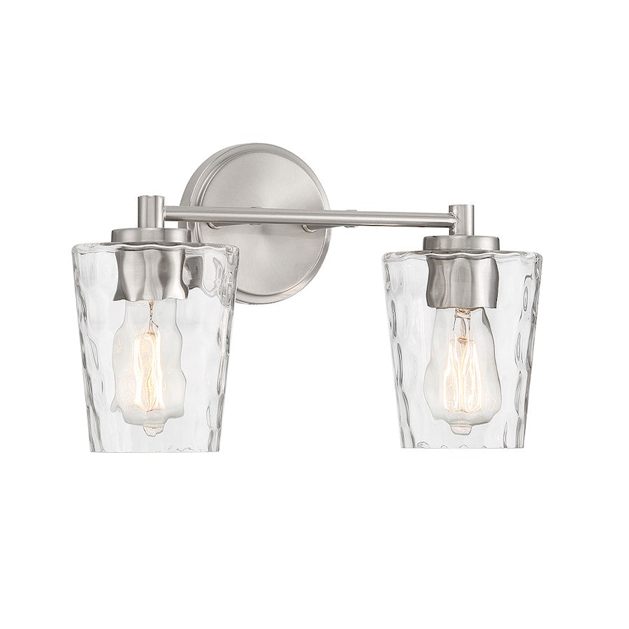 Add a hint of nature-inspired style to your bathroom with the Savoy House Ballas 2-light bath vanity light. Clear hammered glass shades give a watery effect for extra intrigue and dimension. Satin nickel finish. Ballas is 9.75" in height, 15.5" in width and extends 6.5" from the wall. It uses 2 standard size bulbs of up to 60 watts per bulb (bulbs not included).