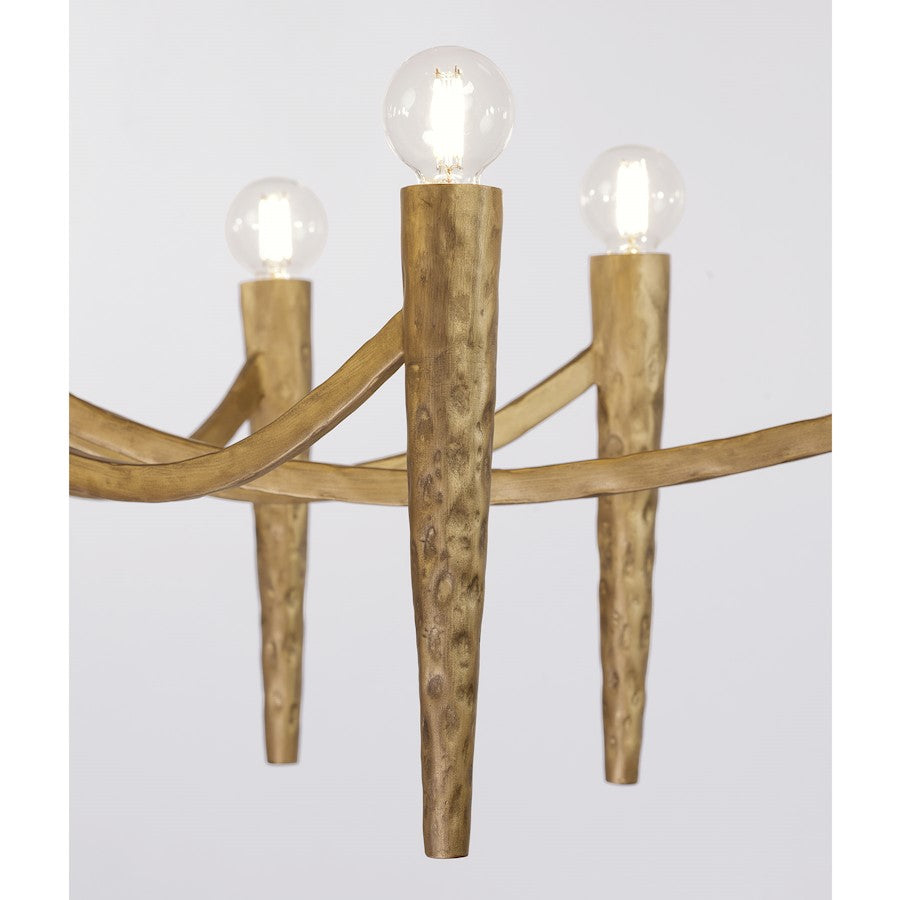 The Savoy House Belleza 10-light linear chandelier was designed by award-winning interior designer and TV host Breegan Jane. Belleza means beauty in Spanish and is an apt description of this sinuous style. Tall, slim arms crafted from hammered metal are finished by hand in Spumante, a gorgeous gold tone that accentuates the mottled detailing of the metal. Belleza is 46" in length, 24" in width and has an adjustable height ranging from 12.63" to 66.63". It uses ten candelabra size bulbs of up to 60 watts per bulb. Bulbs not included. Comes with four 12" downrods and one 6" downrod.