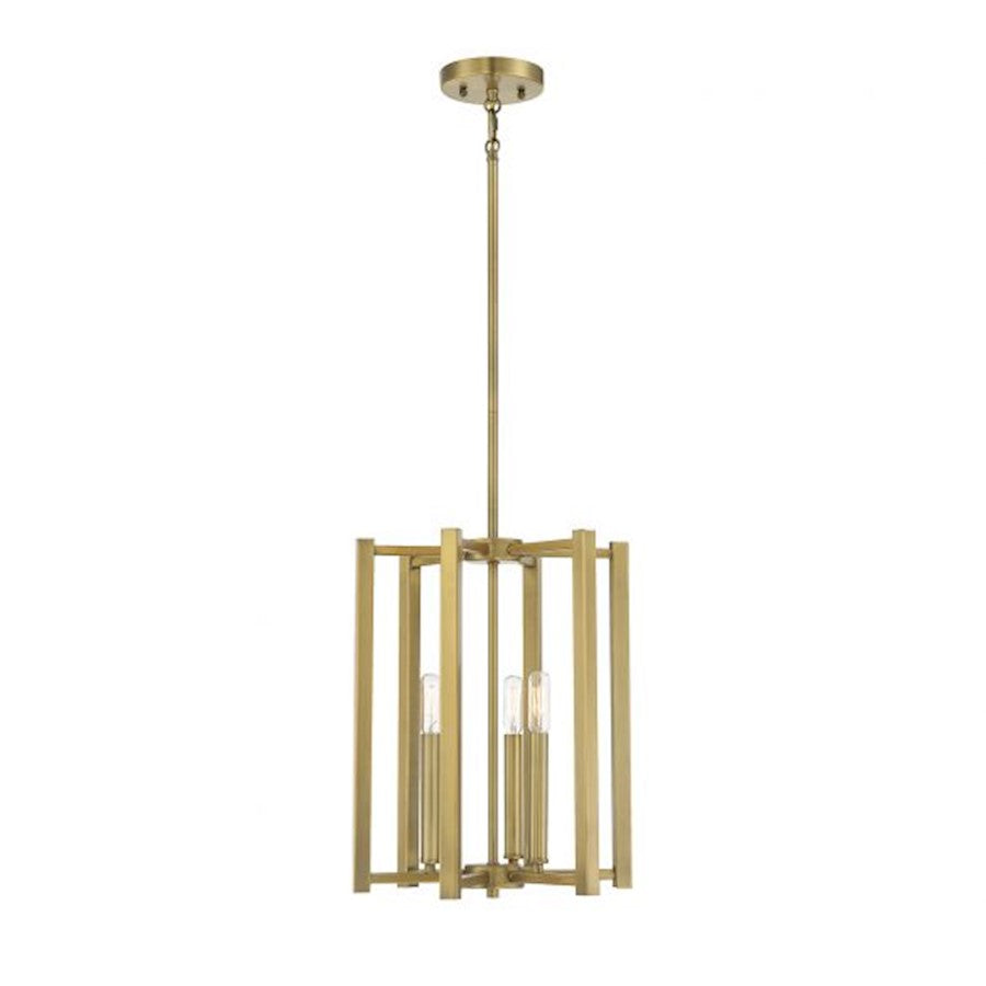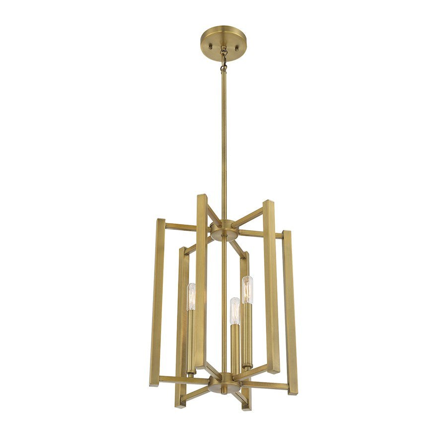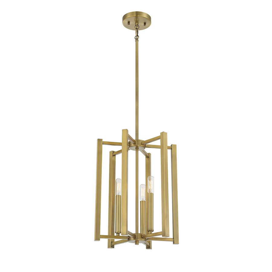 A simple cage with modern flair defines the Benson collection. This universally flattering three-light pendant in a warm brass finish is adjustable in height from 22.5" to 68.5" and is 13" wide. It provides ample illumination from three 60-watt candelabra bulbs.