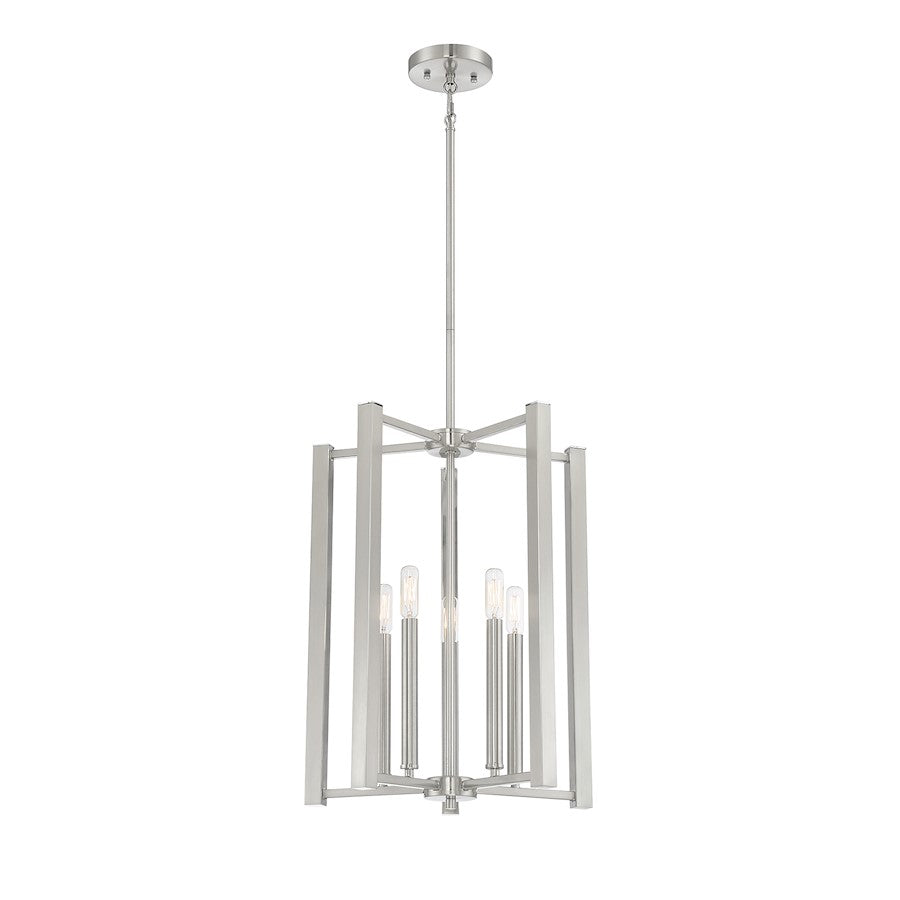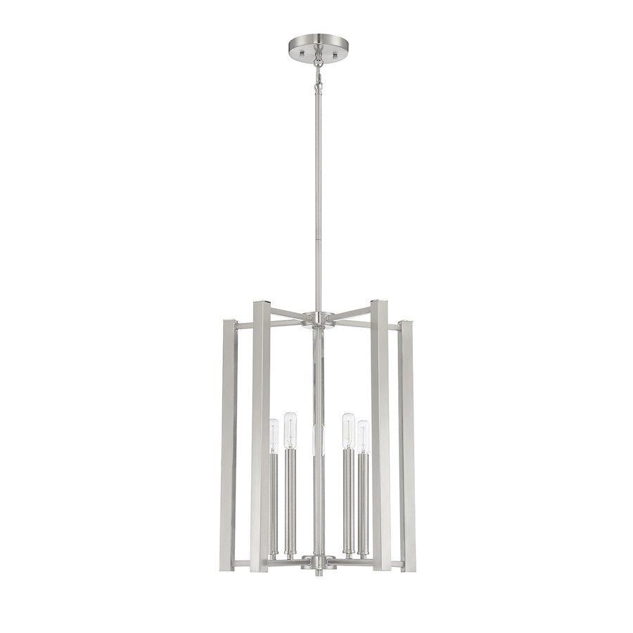 A simple cage with modern flair defines the Benson collection. This universally flattering five-light pendant in a satin nickel finish is adjustable in height from 26" to 74" and is 15.5" wide. It provides ample illumination from five 60-watt candelabra bulbs.