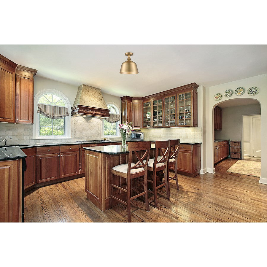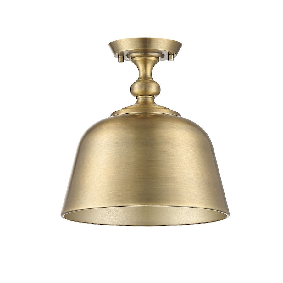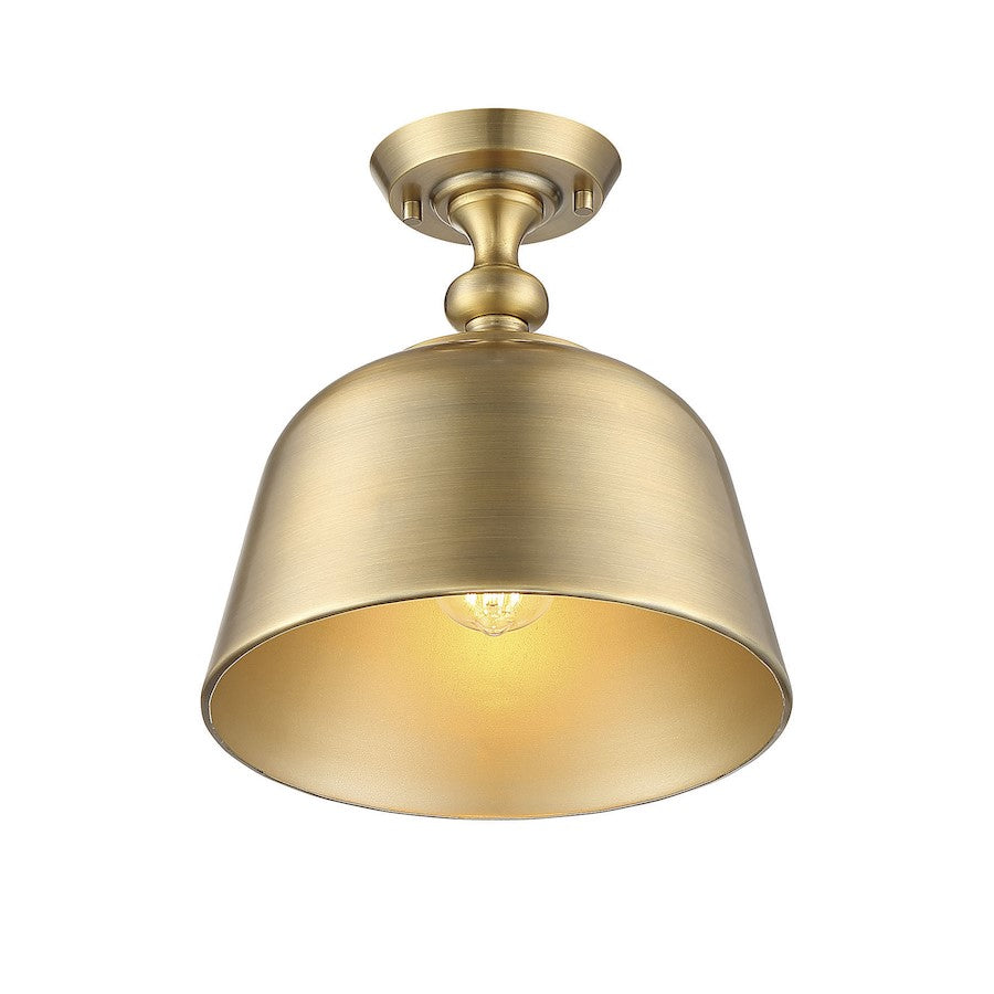 From Savoy House, this Berg 1-light ceiling semi-flush mount is a perfect blend of industrial style and traditional allure. It showcases an oversized metal shade that is finished in warm brass, both inside and out, for a bright and focused glow. Above the shade, hardware details recall the curves of an elegant candlestick. Berg is perfect for times when you would like a more directed beam of light, such as in a small entryway or a kitchen. This fixture is 12" in width and 12" in height. Uses one standard size light bulb of up to 60 watts (not included).