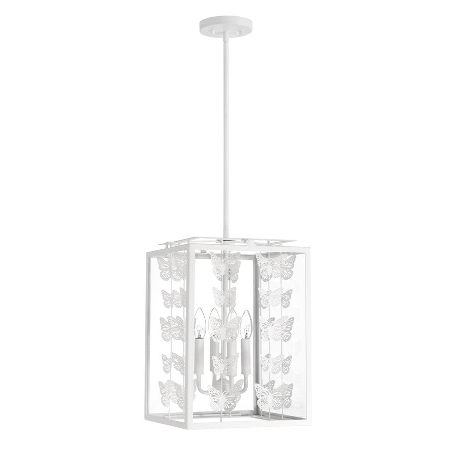 Add a little magic to any room with the whimsical Savoy House Birch 4-light pendant, which features a geometric structure adorned with rows of lovely metal butterflies finished in Bisque White. Clear glass panes frame everything beautifully. Birch is 12" in width and has an adjustable height ranging from 17" to 71". Comes with four 12" downrods and one 6" downrod. Uses four candelabra size bulbs of up to 60 watts per bulb. Bulbs are not included.