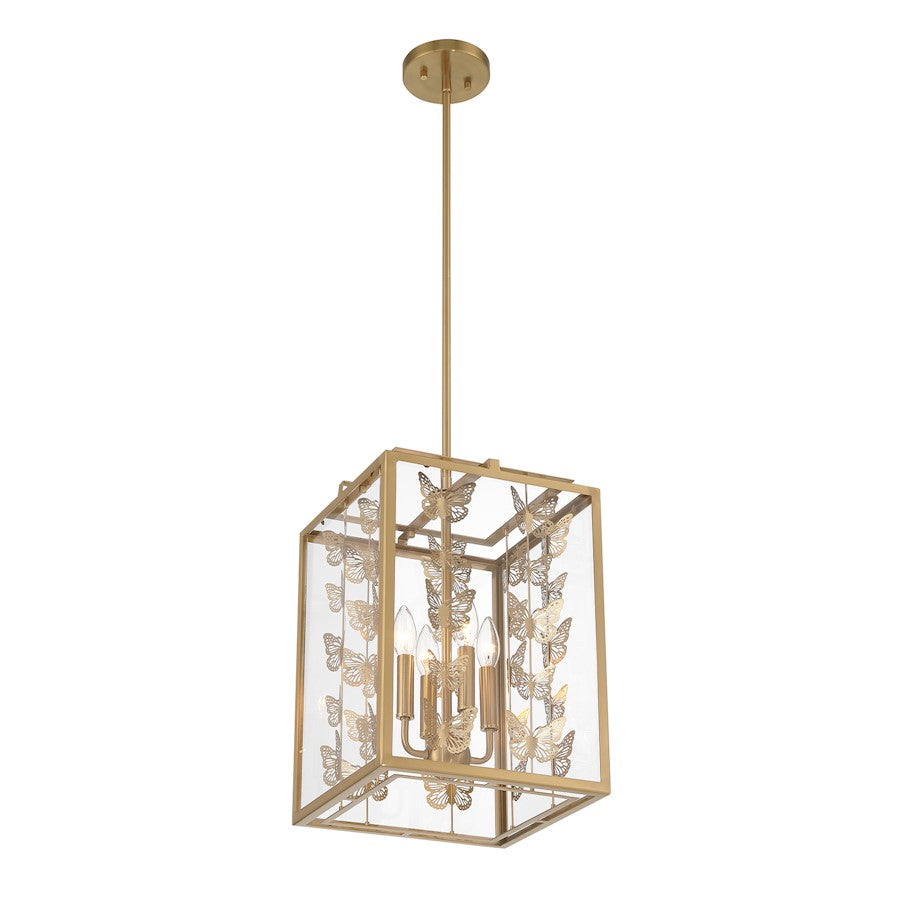 Add a little magic to any room with the whimsical Savoy House Birch 4-light pendant, which features a geometric structure adorned with rows of lovely metal butterflies finished in Burnished Brass. Clear glass panes frame everything beautifully. Birch is 12" in width and has an adjustable height ranging from 17" to 71". Comes with four 12" downrods and one 6" downrod. Uses four candelabra size bulbs of up to 60 watts per bulb. Bulbs are not included.