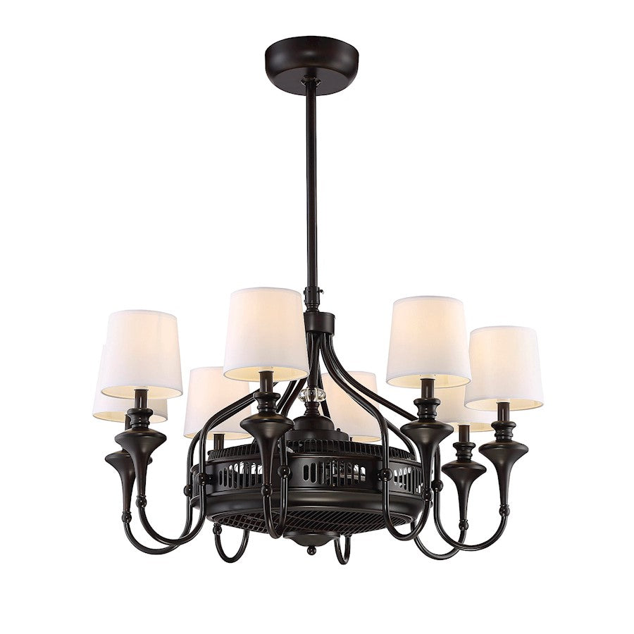 A classic chandelier design meets air circulation functionality in this Savoy House Brisa Fan D'Lier. Improve the comfort while you beautify your home with the elegance of this traditional style fixture. The graceful curved frame, upswept light arms, finial and detailed candle cups all have a rich, dark English bronze finish and each light has a tasteful off-white fabric drum shade. The fan housing features a decorative open grill structure for maximum air flow. Plus, eight 4W LED dimmable bulbs are included, so you can choose the perfect amount of illumination at any time. (A handheld remote with independent light control is included, too.) 34.75" wide and 24.13" high with an 18" downrod, so it’s ideal for your dining room, living room, family room, bedroom, enclosed porch or office.