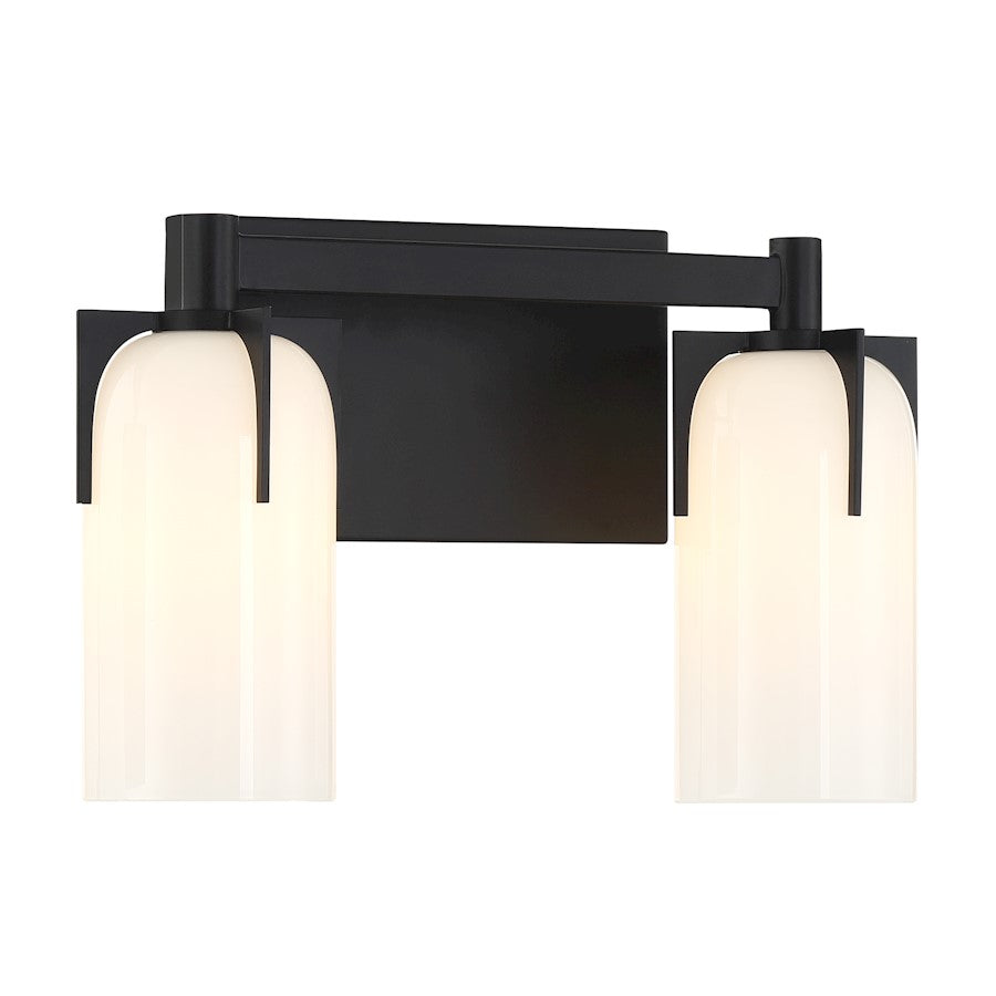 Bring fashionable, vintage-inspired lighting home with the Savoy House Caldwell 2-light bath bar. Etched white opal glass shades are held in place with dramatic jewelry-like prongs that are finished in Matte Black. Caldwell is 8.5" in height, 14.75" in width and extends 5.5" from the wall. It uses two candelabra size bulbs of up to 60 watts per bulb. Bulbs not included. This bath light is damp area rated and must be installed as shown.