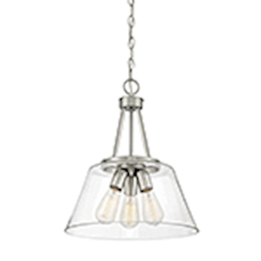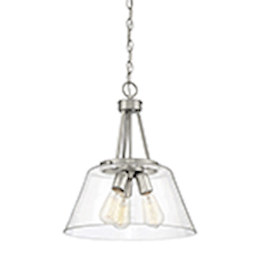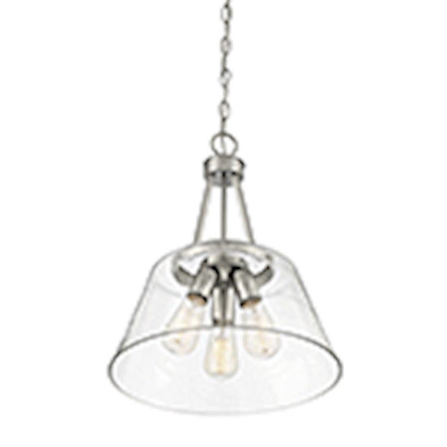 The Calhoun collection is distinguished by simple lines that can easily enhance transitional and contemporary décor. Measuring 18" high x 15" wide, this three-light pendant offers a clean silhouette in a satin nickel finish and clear glass shades. It is illuminated by three 60-watt standard size bulbs.