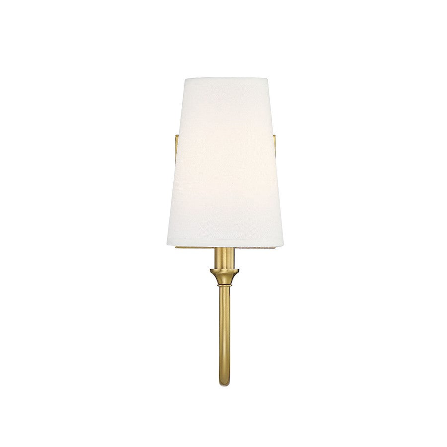Bring the understated, classic beauty of the Savoy House Cameron 1-light sconce into your home to create a thoughtful accent in any room or hallway. This sconce features a slender, dramatically-curving arm topped with a tall, tapered white fabric shade, ensuring a comfortable glow. The faceted backplate adds another dimension of style, too. Finished in warm brass. This fixture is 5" wide and 13" tall. It extends 8" from the wall. Uses a candelabra size bulb of up to 40 watts (not included).