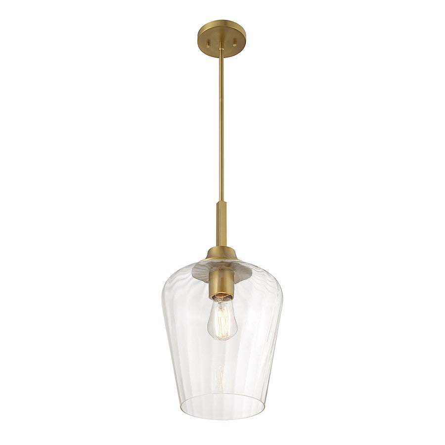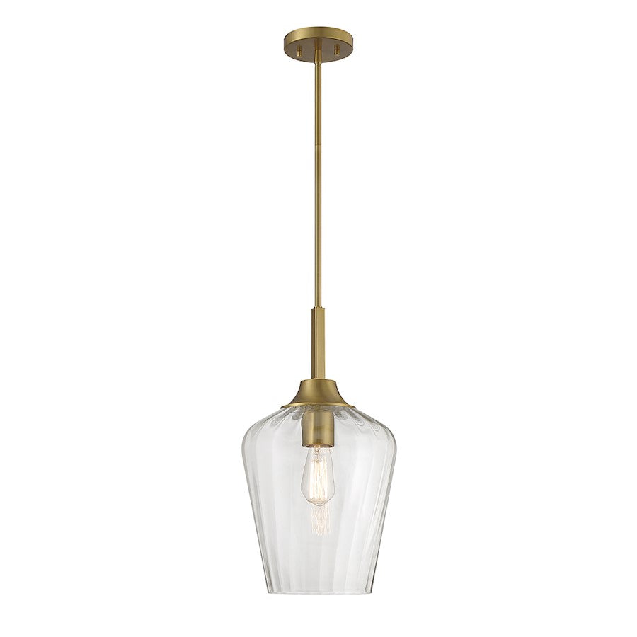The Savoy House Carlton 1-light pendant features a beautifully streamlined style highlighted by a shade of ribbed glass that gives a hint of motion. Finished in warm brass. Carlton is 11" in width and has an adjustable height ranging from 20.5" to 74". Comes with four 12" downrods and one 6" downrod. Uses 1 standard size bulb with a max of 60 watts (bulb not included).