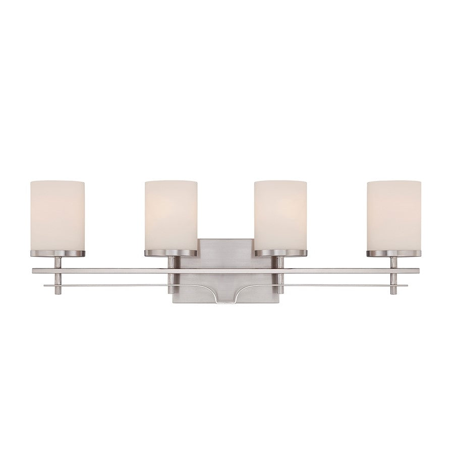 Good lighting is key to good home design. A great light fixture sets the mood, ensuring that everyone feels comfortable, and that’s exactly what the Colton does. It’s a sleek design made with Savoy House’s meticulous craftsmanship and high quality materials, creating a fixture with terrific performance and impeccable style. The graceful curved frame has streamlined detailing and a satin nickel finish. Four 60W standard size bulbs sit within cylindrical shades of lovely white opal glass to create a soothing, flattering and inviting glow. This bath light is 28.5" wide and 9" high, making it an elegant and timeless style for your bathroom or powder room.