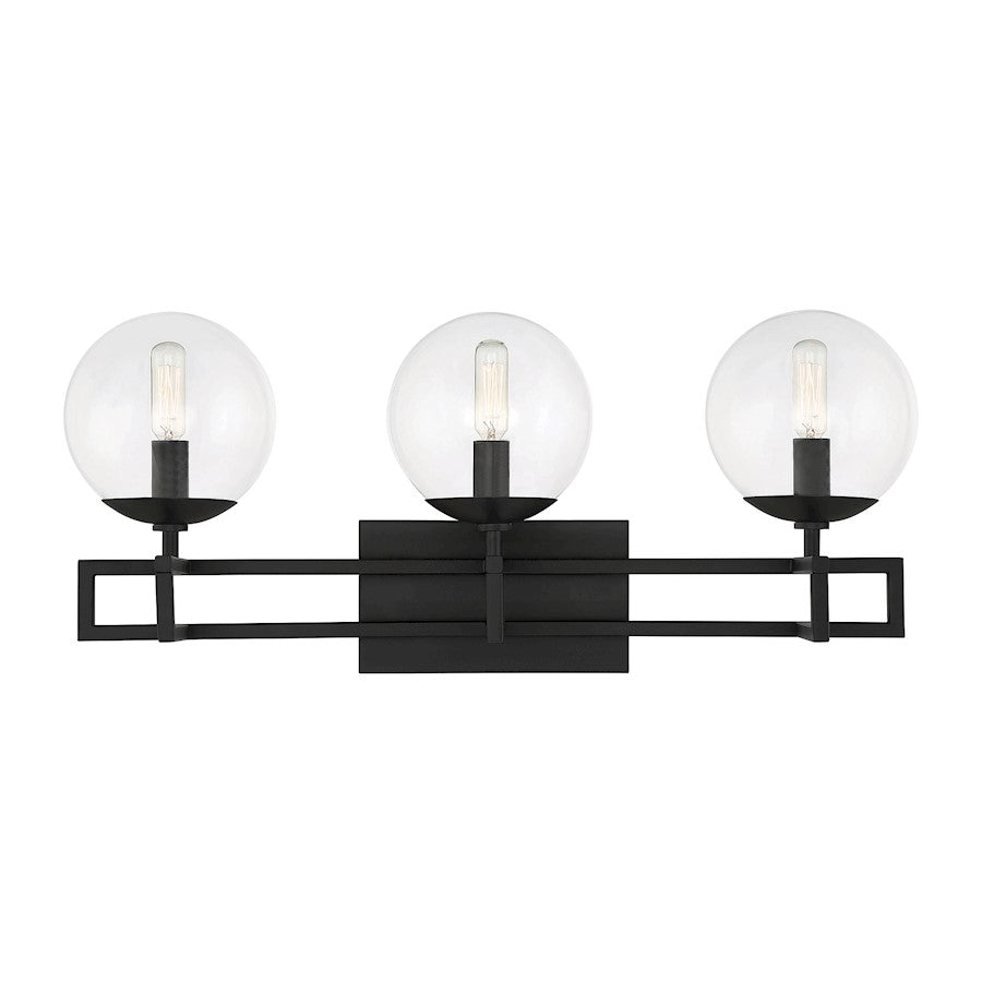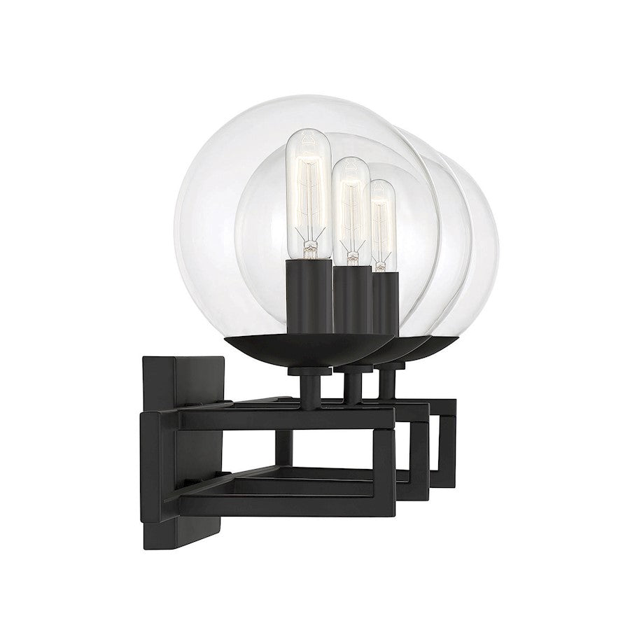 There’s a certain beauty to be found in the idea of an intersection, the place where everything comes together. The Savoy House Crosby 3-light bath vanity light showcases that beauty with lights nestled in clear glass orbs and placed strategically on intersecting arms. Finished in matte black. Crosby is 10.5" in height, 24" in width and extends 7.5" from the wall. It uses three candelabra size bulbs of up to 60 watts per bulb. Damp area rated.