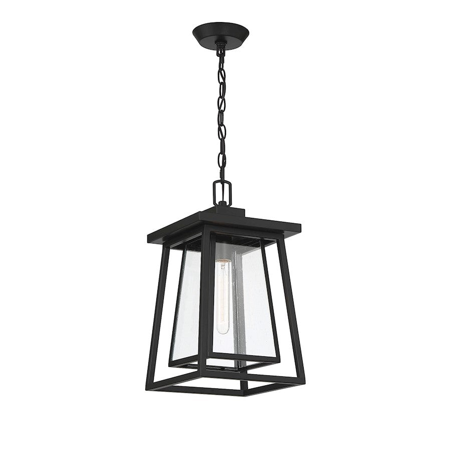Boost your curb appeal and create a great first impression with the Craftsman-inspired style of the Savoy House Denver 1-light outdoor hanging lantern. Clear seedy glass and a matte black finish make Denver a great choice for lighting up today's fashionable homes. This fixture is 16.13" in height and 8" in width. It uses one standard size bulb with a max of 60 watts. Damp area rated. Comes with 120" of chain and 144" of cord.