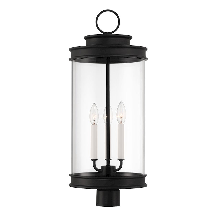 Classic lantern style gets a fresh new look in the Savoy House Englewood 3-light outdoor post light. A beautiful cylinder of clear glass is held in a minimally detailed frame finished in timeless Matte Black. White candle covers create a perfect pairing with the finish. Englewood is 26" in height and 10.5" in width. Uses three candelabra size bulbs of up to 60 watts per bulb. Bulbs not included. Wet area rated.